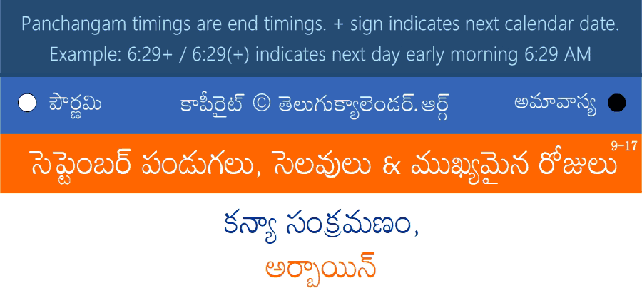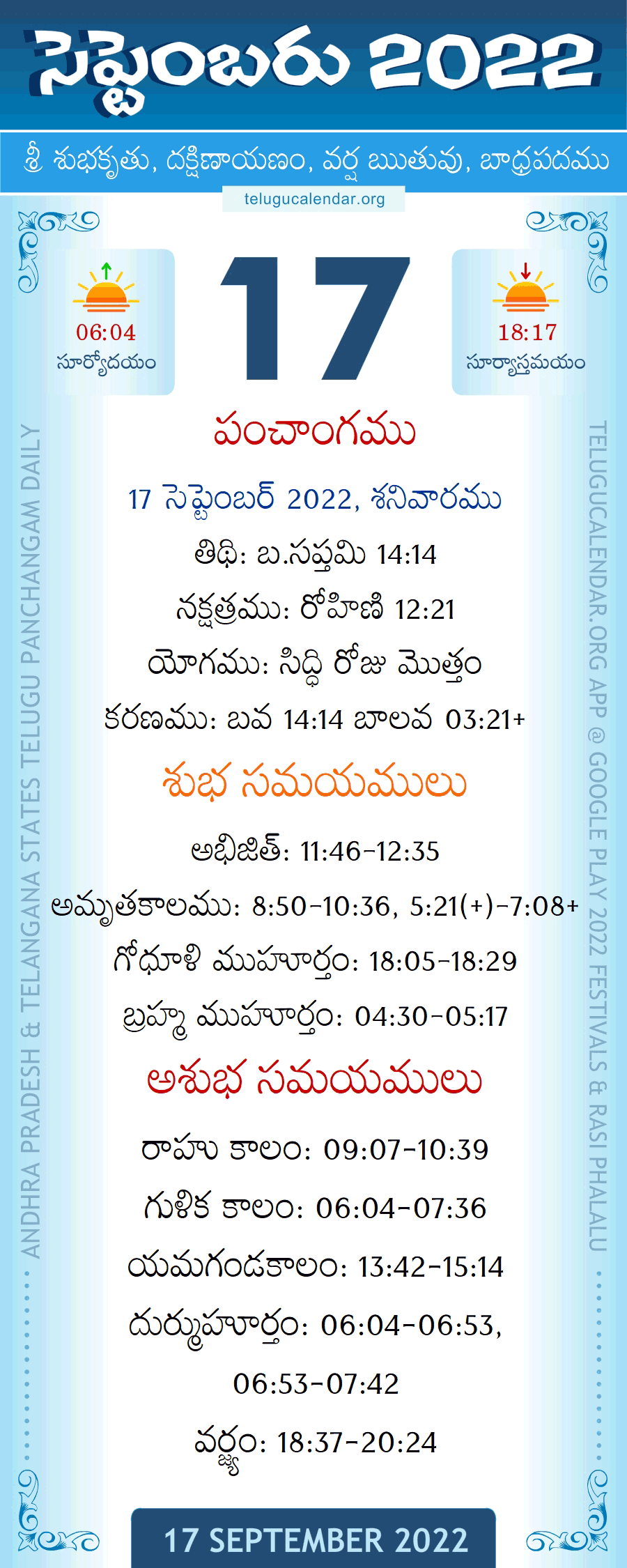 September 17, 2022 Panchangam Telugu Calendar Daily with Festivals, Subha Samayalu and Asubha Samayalu Timings.