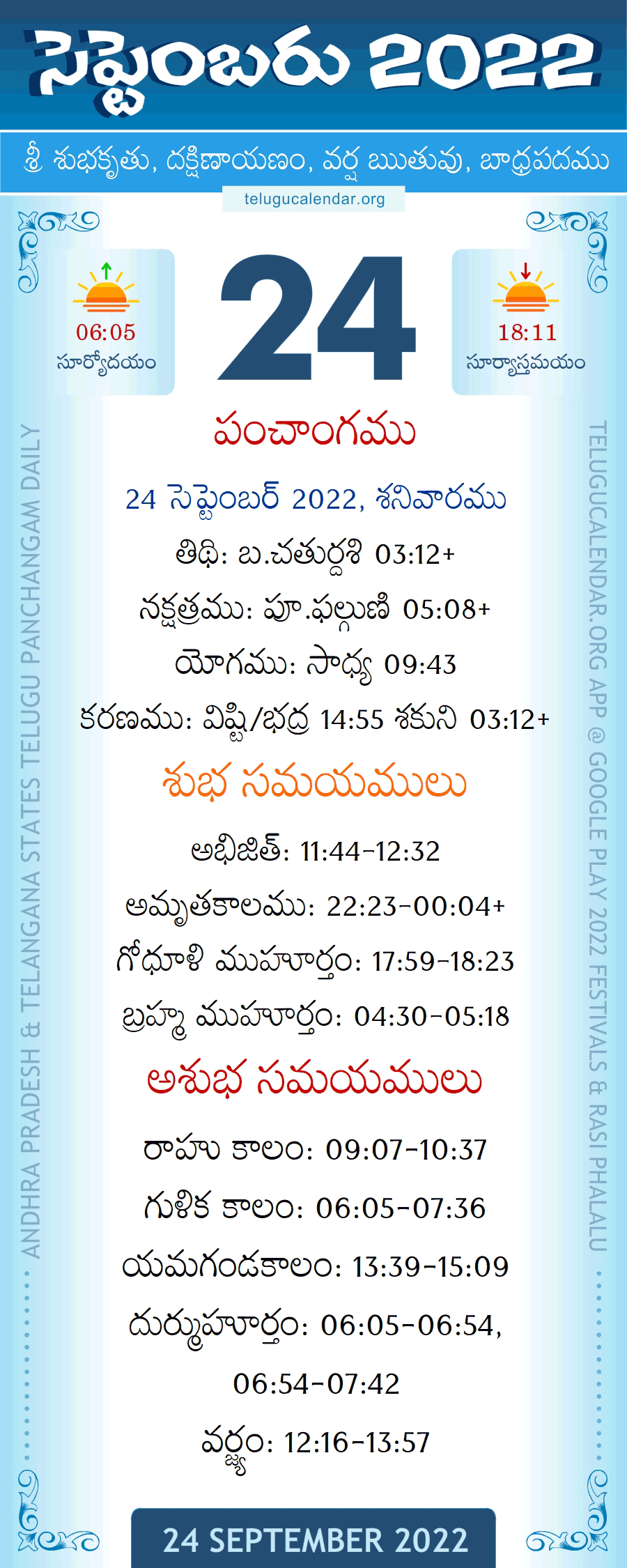 September 24, 2022 Panchangam Telugu Calendar Daily with Festivals, Subha Samayalu and Asubha Samayalu Timings.