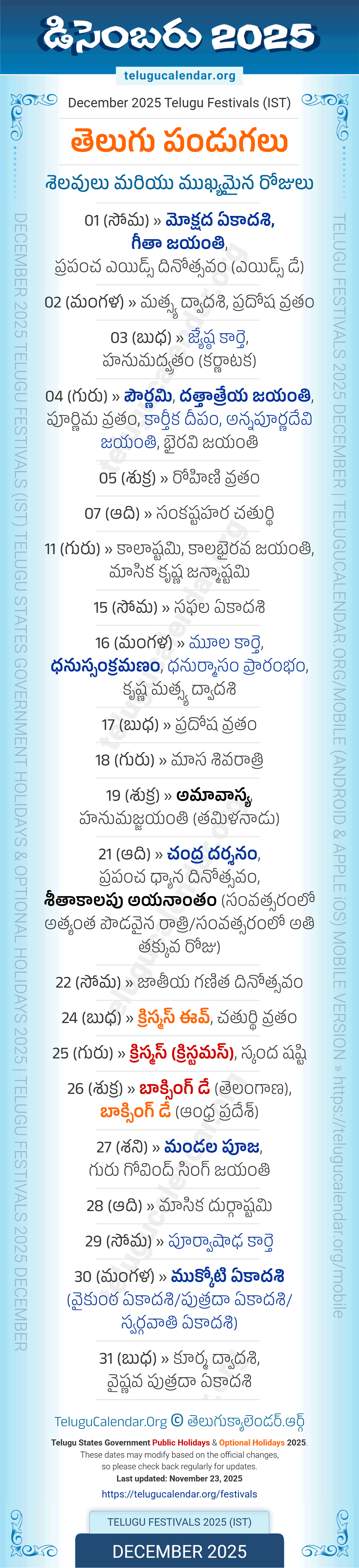 Telugu Festivals 2025 December (IST) in Telugu for Telugu States. Download 2025 Telugu Festivals December PDF for personal use