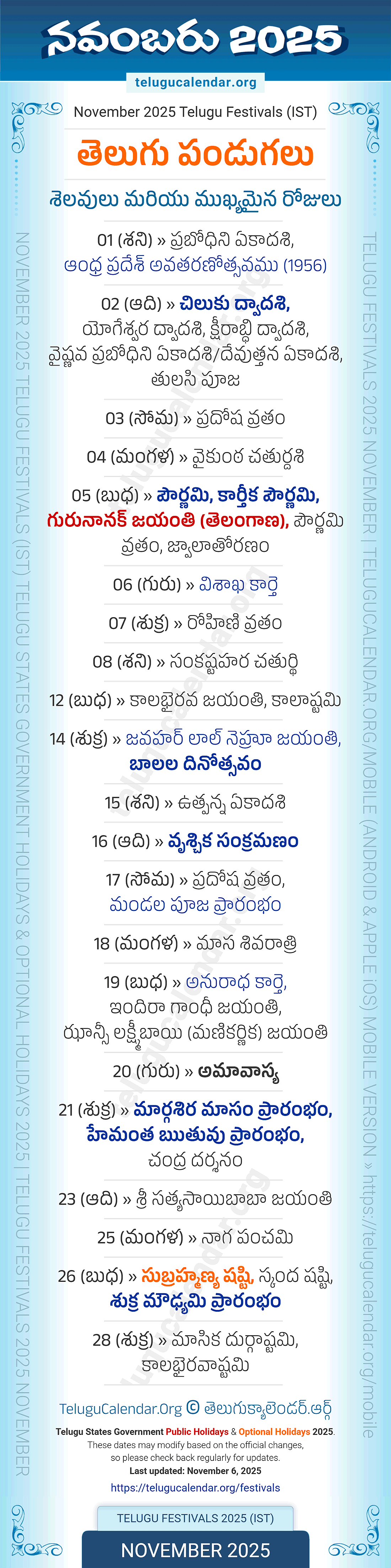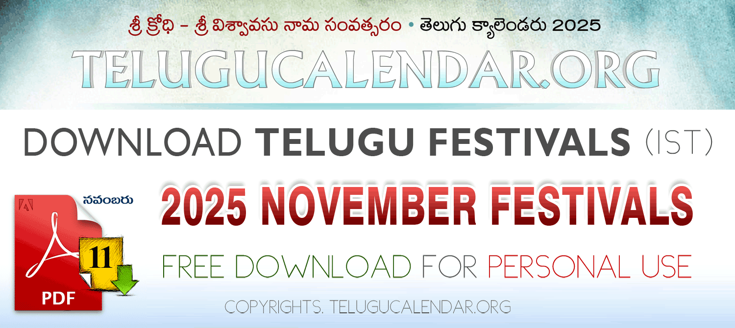 Telugu Festivals 2025 November (IST) in Telugu for Telugu States. Download 2025 Telugu Festivals November PDF for personal use
