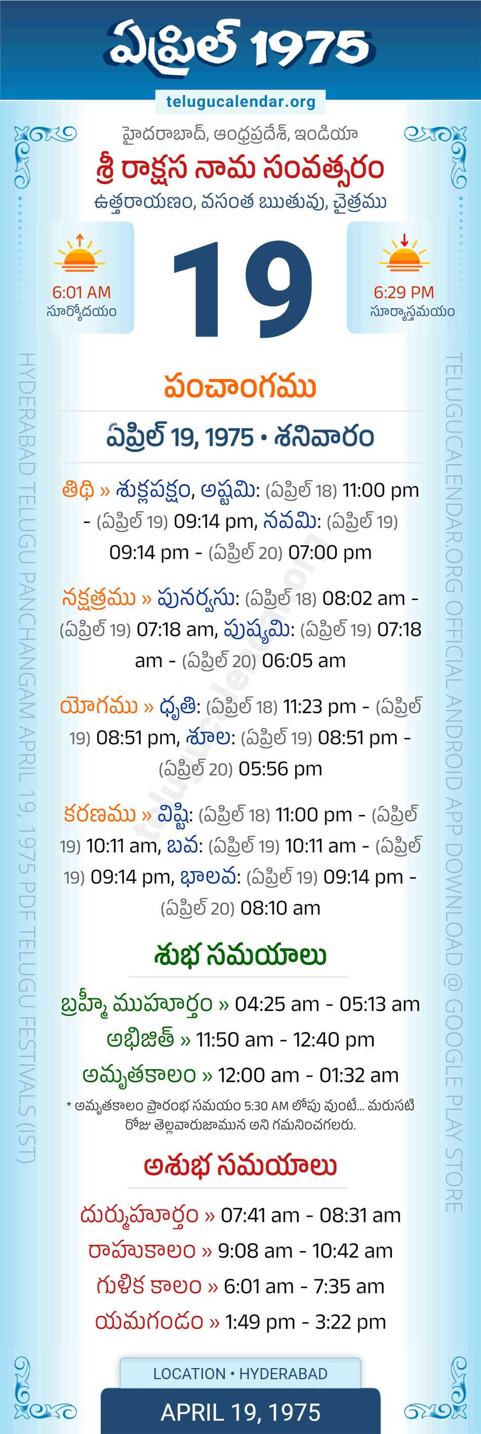 Download » April 19, 1975 » Hyderabad, Andhra Pradesh Telugu Calendar Panchangam Daily Sheet with Auspicious and Inauspicious Timings.