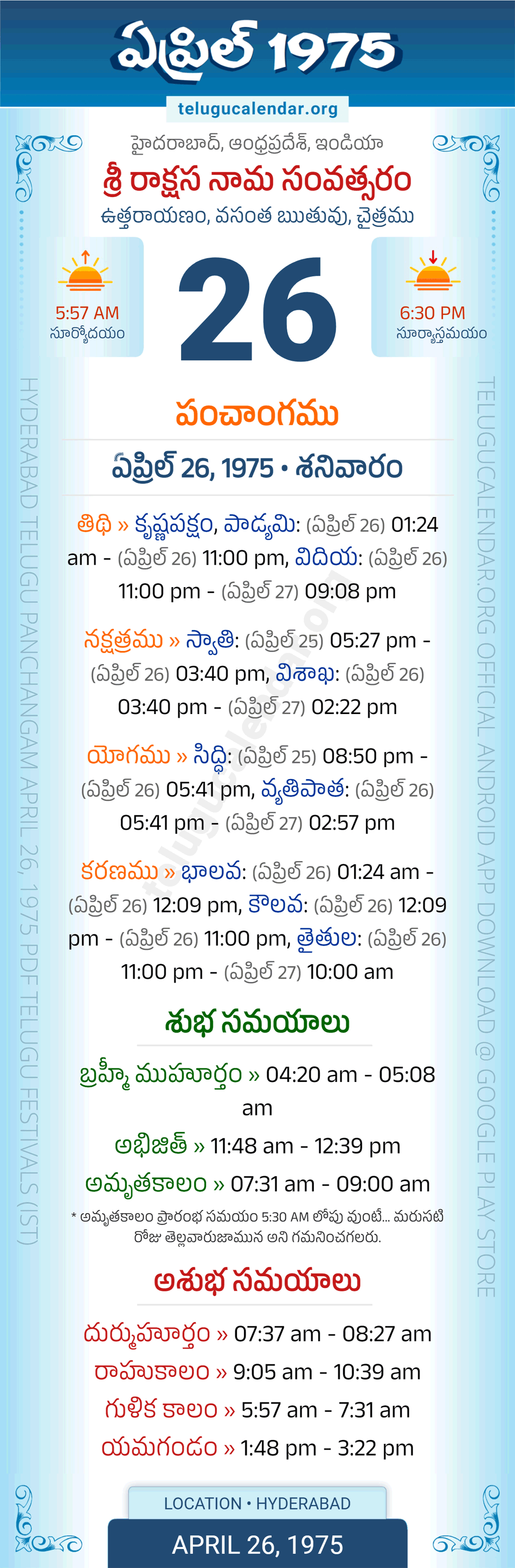 Download » April 26, 1975 » Hyderabad, Andhra Pradesh Telugu Calendar Panchangam Daily Sheet with Auspicious and Inauspicious Timings.