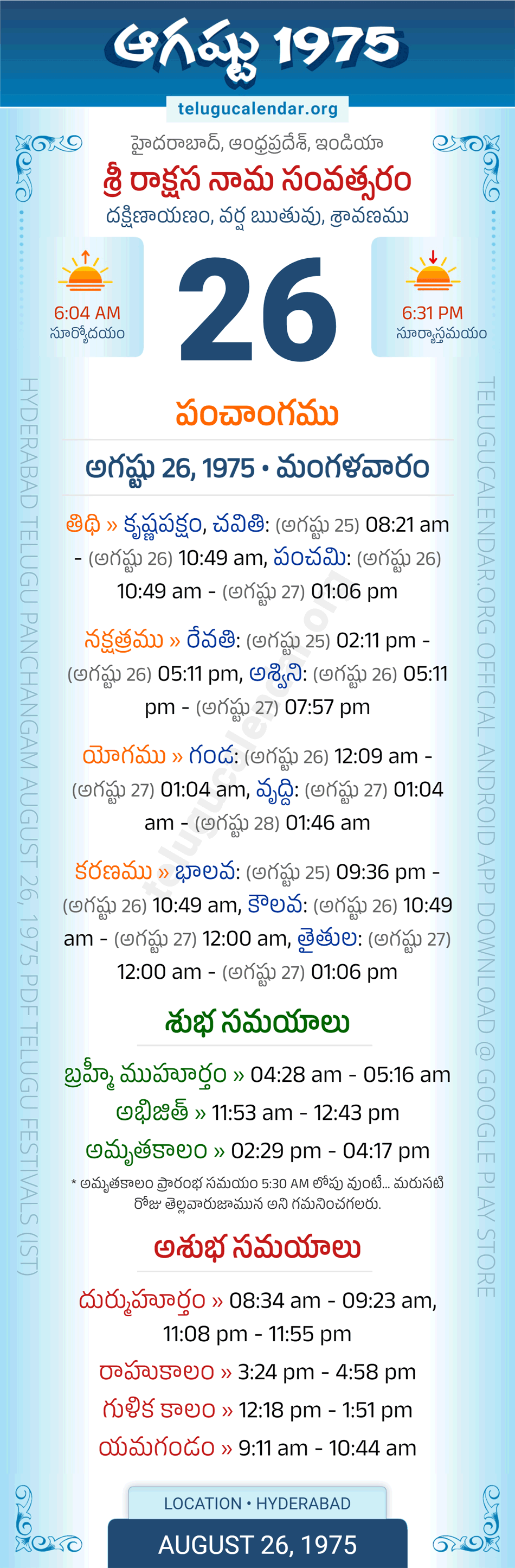Download » August 26, 1975 » Hyderabad, Andhra Pradesh Telugu Calendar Panchangam Daily Sheet with Auspicious and Inauspicious Timings.