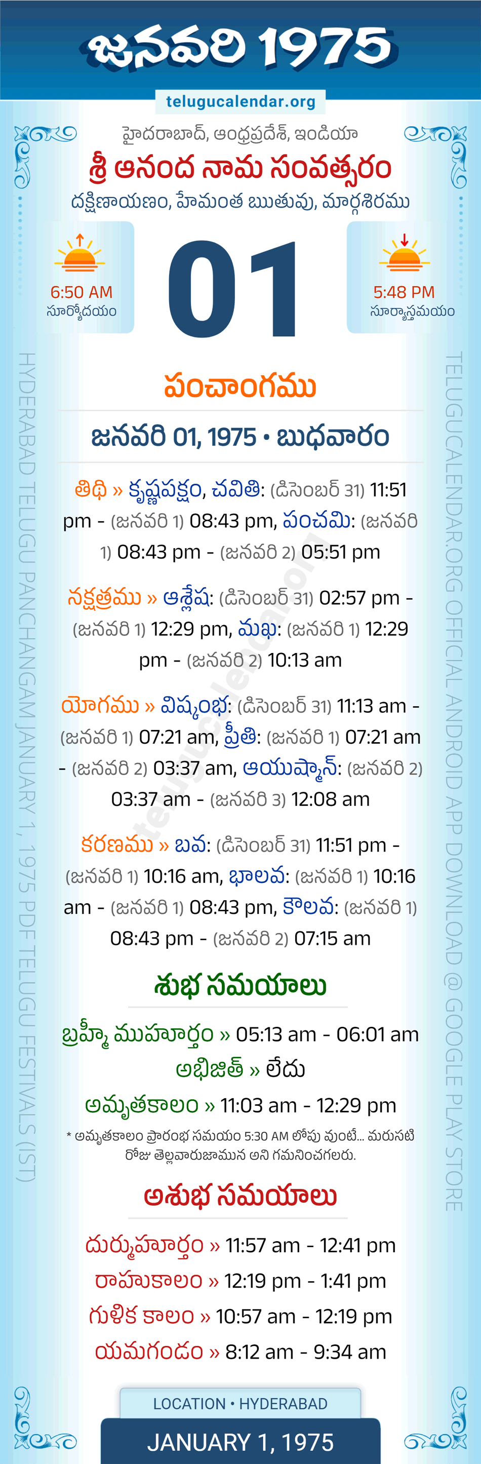 Apart from the Panchangam 1975, you can also find the Sunrise and Sunset (Middle Limb) timings, Paksham, Telugu Year, Yanam, Rutuvu, Telugu Month for Hyderabad. Auspicious Period January 1, 1975 for Hyderabad (Today Good Timings like Abhijit Muhurtham, Amruta Kalam & Brahma Muhurtham) and Inauspicious Period January 1, 1975 for Hyderabad (Bad Timings like Durmuhurtham, Rahukalam, Gulika kalam & Yamagandam) with starting and end timings in the above image in Telugu Language.