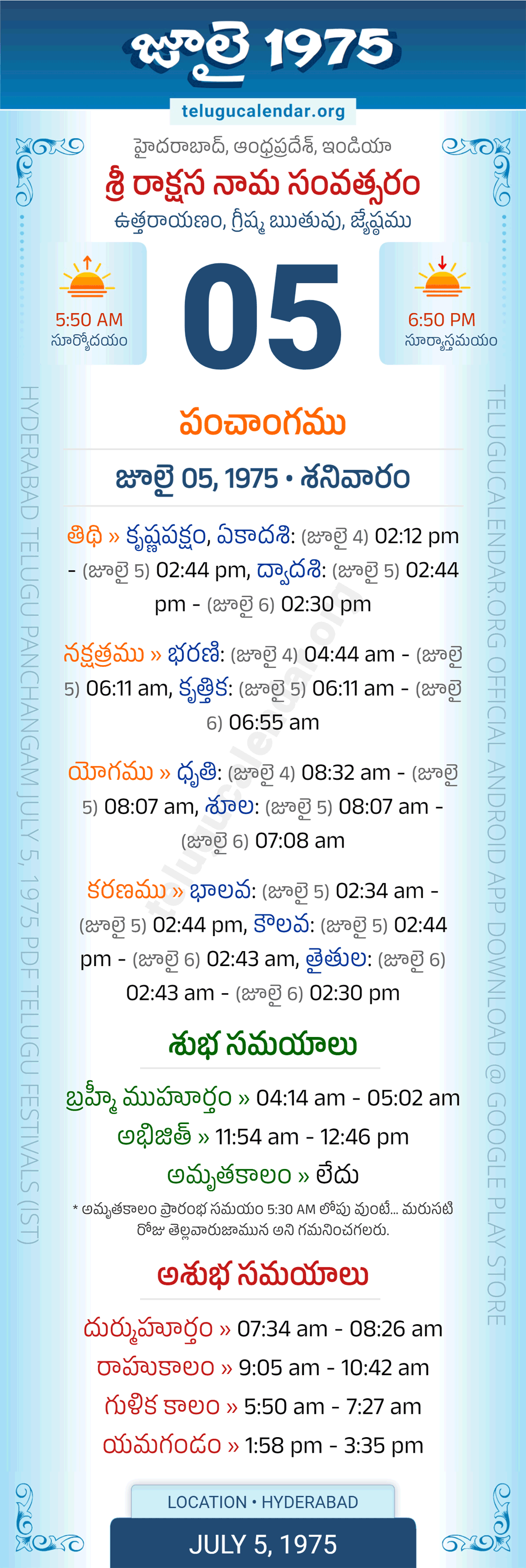 Download » July 5, 1975 » Hyderabad, Andhra Pradesh Telugu Calendar Panchangam Daily Sheet with Auspicious and Inauspicious Timings.