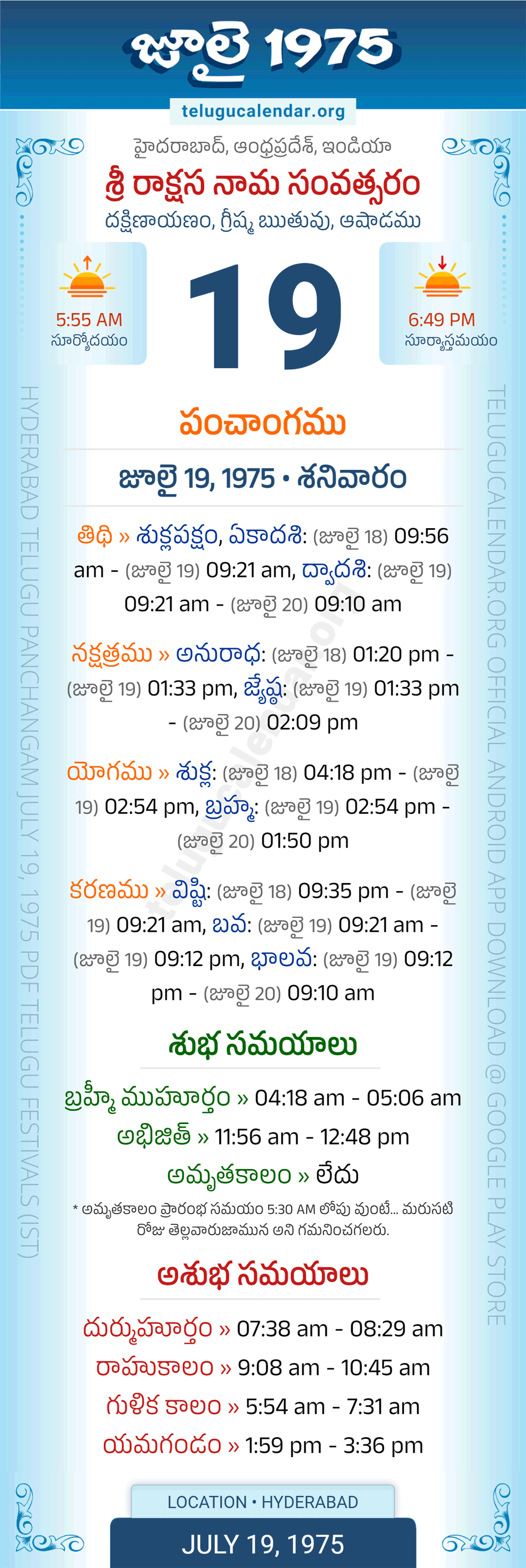 Apart from the Panchangam 1975, you can also find the Sunrise and Sunset (Middle Limb) timings, Paksham, Telugu Year, Yanam, Rutuvu, Telugu Month for Hyderabad. Auspicious Period July 19, 1975 for Hyderabad (Today Good Timings like Abhijit Muhurtham, Amruta Kalam & Brahma Muhurtham) and Inauspicious Period July 19, 1975 for Hyderabad (Bad Timings like Durmuhurtham, Rahukalam, Gulika kalam & Yamagandam) with starting and end timings in the above image in Telugu Language.