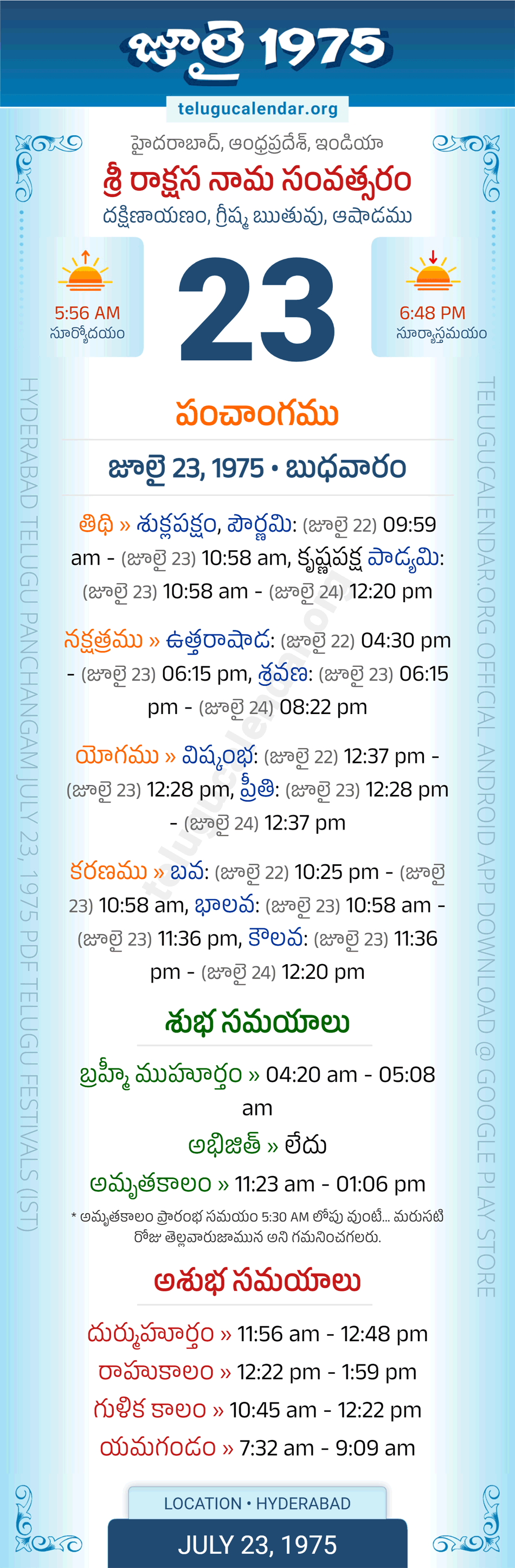 Apart from the Panchangam 1975, you can also find the Sunrise and Sunset (Middle Limb) timings, Paksham, Telugu Year, Yanam, Rutuvu, Telugu Month for Hyderabad. Auspicious Period July 23, 1975 for Hyderabad (Today Good Timings like Abhijit Muhurtham, Amruta Kalam & Brahma Muhurtham) and Inauspicious Period July 23, 1975 for Hyderabad (Bad Timings like Durmuhurtham, Rahukalam, Gulika kalam & Yamagandam) with starting and end timings in the above image in Telugu Language.