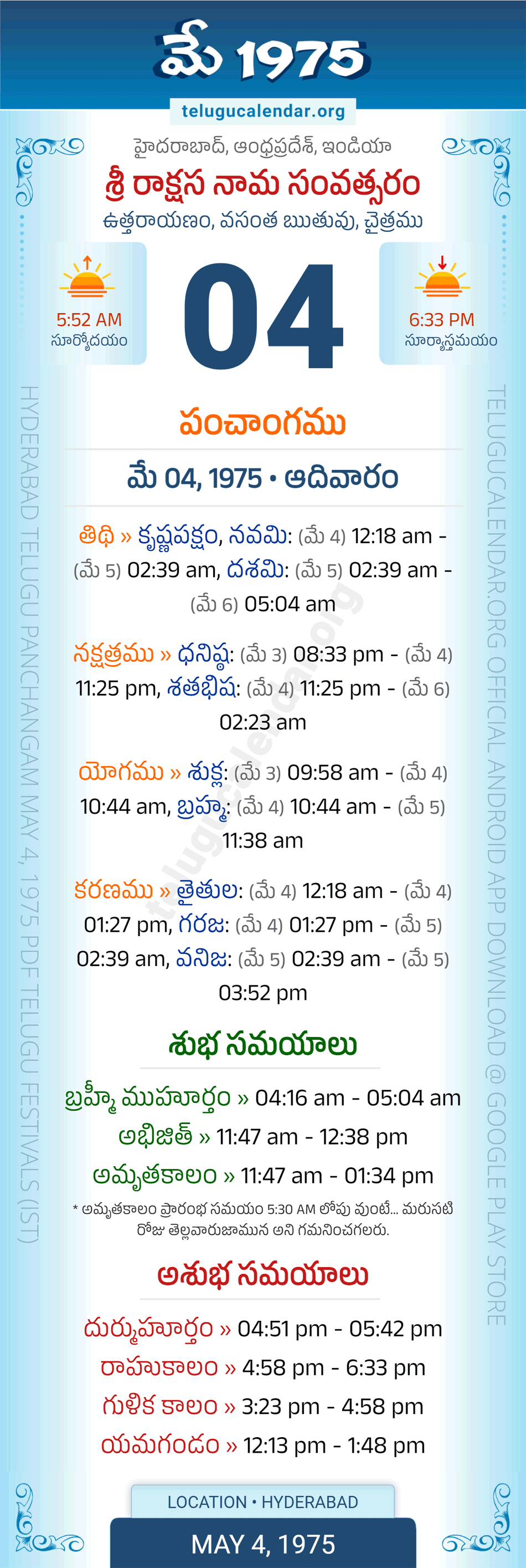 Download » May 4, 1975 » Hyderabad, Andhra Pradesh Telugu Calendar Panchangam Daily Sheet with Auspicious and Inauspicious Timings.