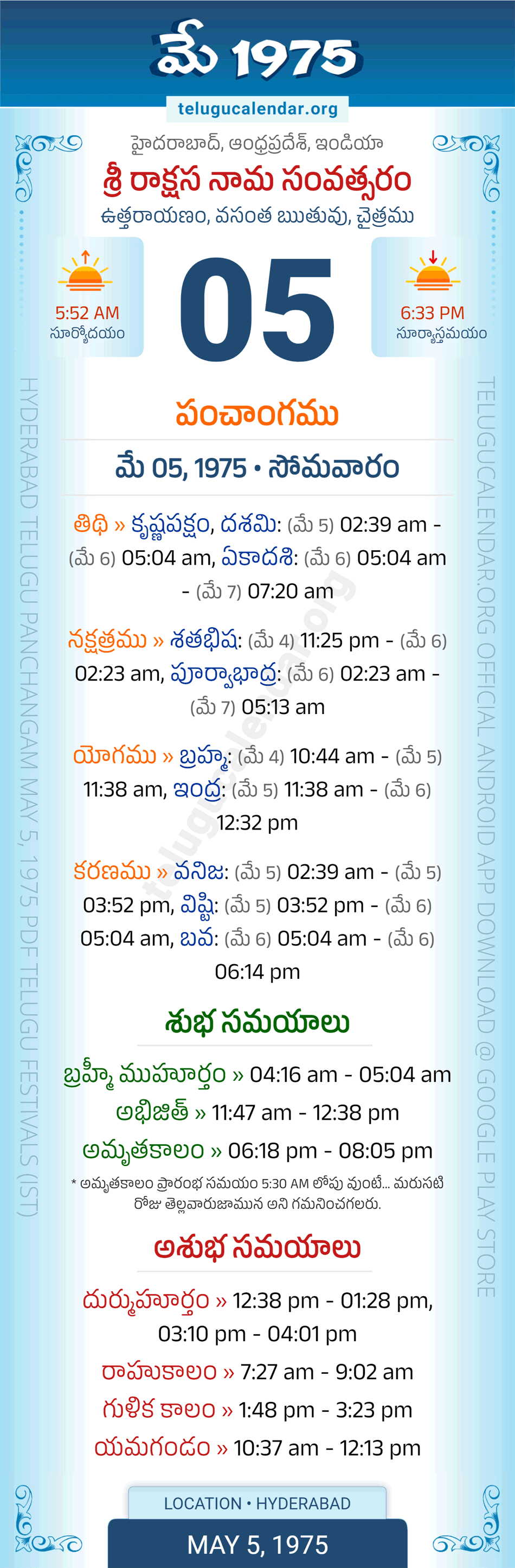 Download » May 5, 1975 » Hyderabad, Andhra Pradesh Telugu Calendar Panchangam Daily Sheet with Auspicious and Inauspicious Timings.