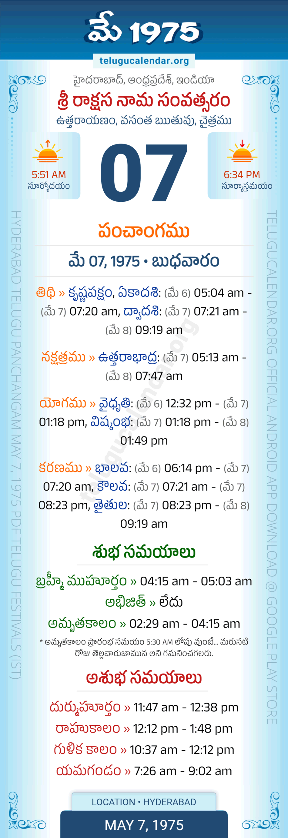 Download » May 7, 1975 » Hyderabad, Andhra Pradesh Telugu Calendar Panchangam Daily Sheet with Auspicious and Inauspicious Timings.