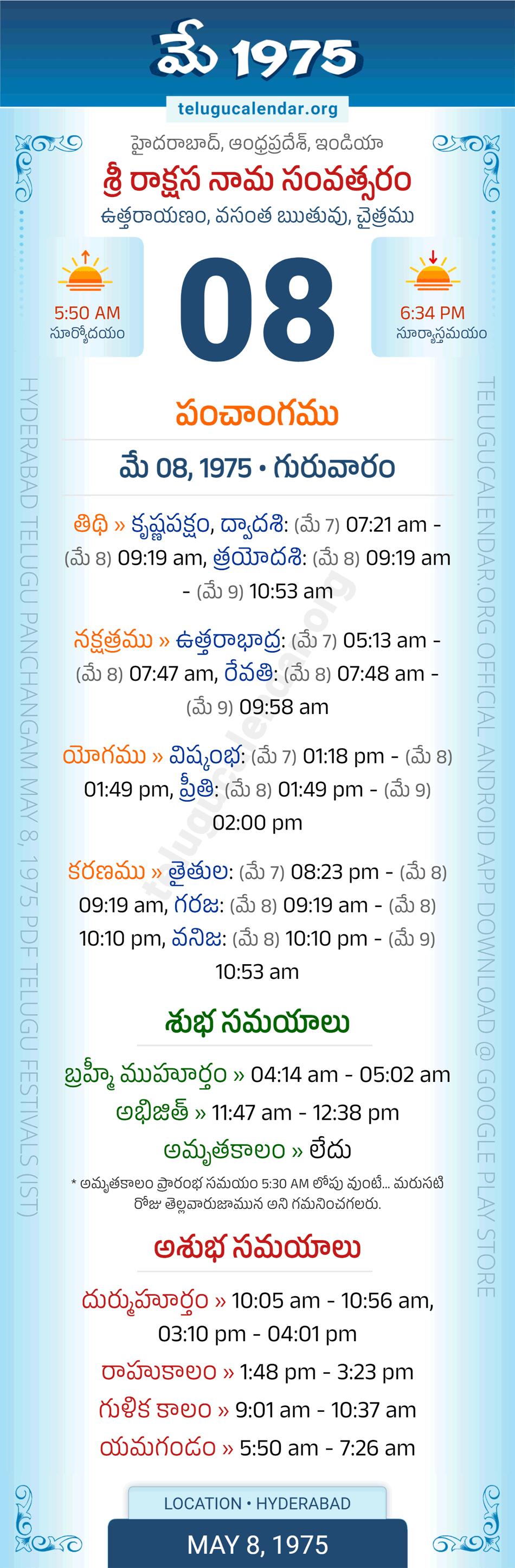 Download » May 8, 1975 » Hyderabad, Andhra Pradesh Telugu Calendar Panchangam Daily Sheet with Auspicious and Inauspicious Timings.