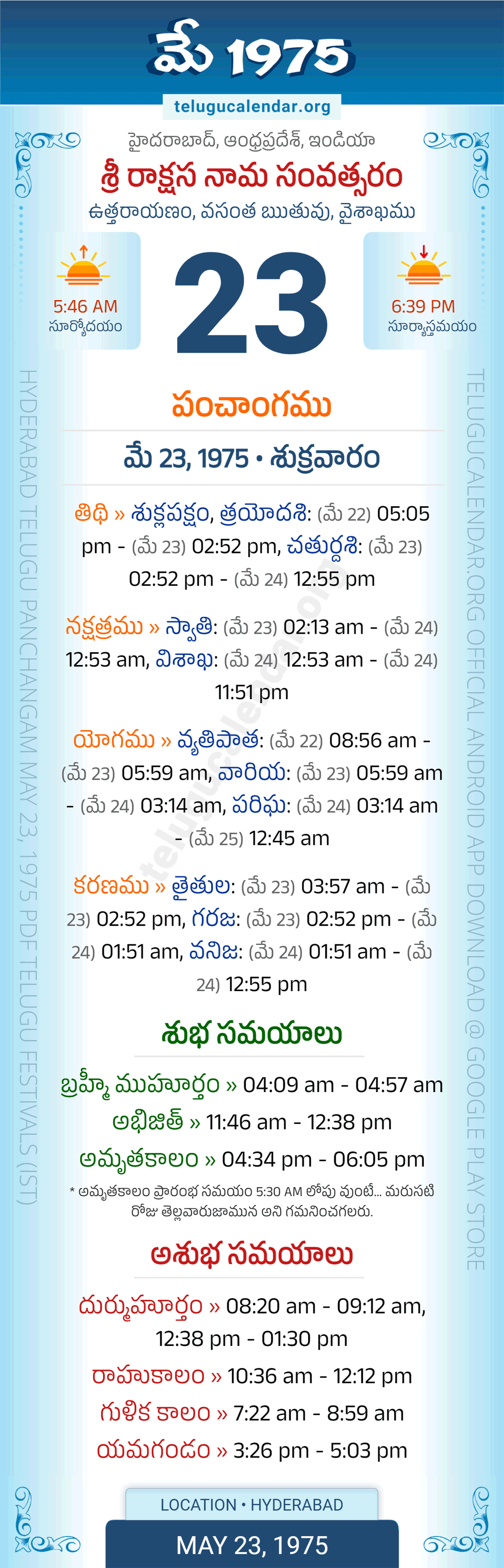 Download » May 23, 1975 » Hyderabad, Andhra Pradesh Telugu Calendar Panchangam Daily Sheet with Auspicious and Inauspicious Timings.