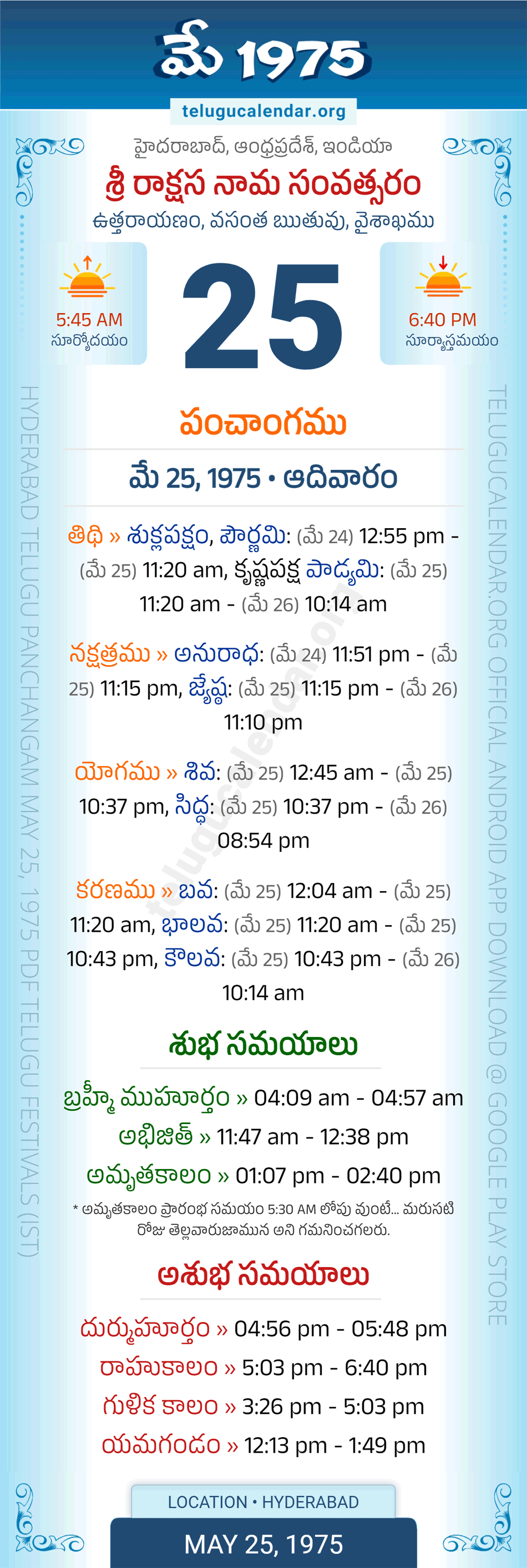 Download » May 25, 1975 » Hyderabad, Andhra Pradesh Telugu Calendar Panchangam Daily Sheet with Auspicious and Inauspicious Timings.