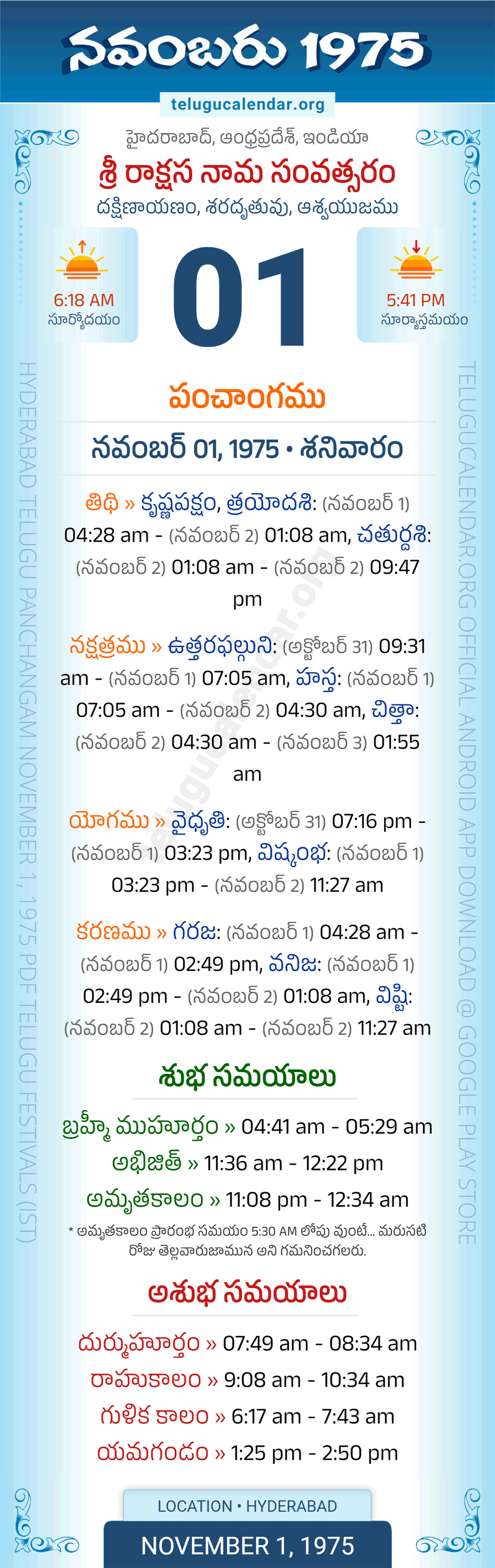 Download » November 1, 1975 » Hyderabad, Andhra Pradesh Telugu Calendar Panchangam Daily Sheet with Auspicious and Inauspicious Timings.