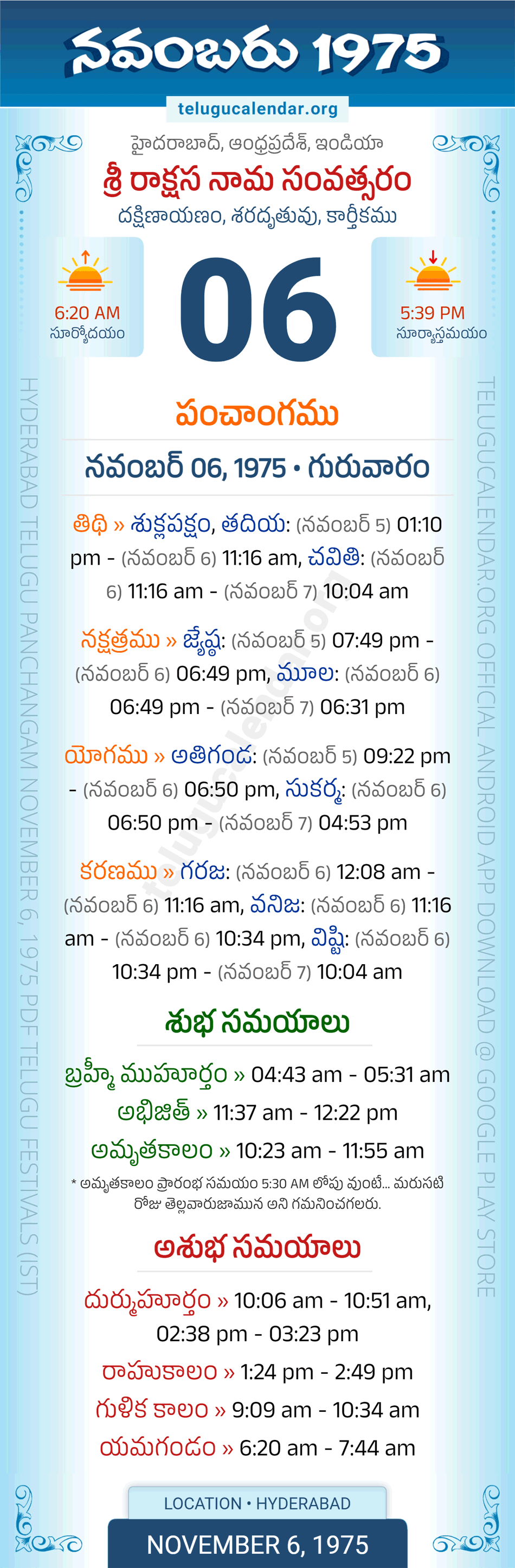 Download » November 6, 1975 » Hyderabad, Andhra Pradesh Telugu Calendar Panchangam Daily Sheet with Auspicious and Inauspicious Timings.