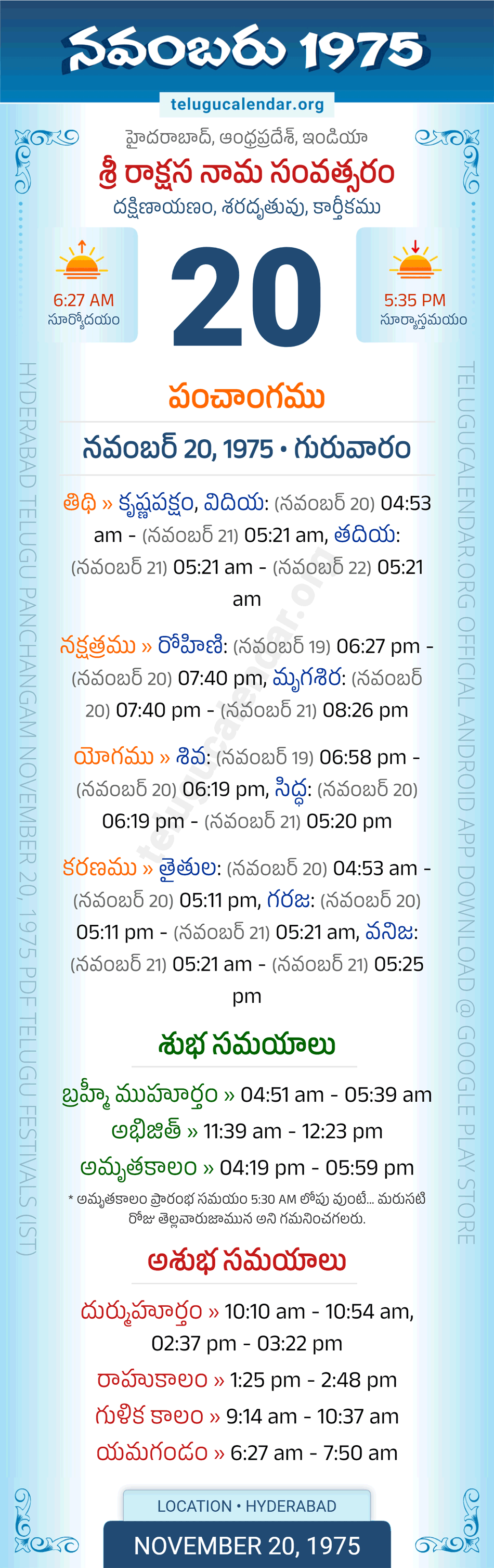 Download » November 20, 1975 » Hyderabad, Andhra Pradesh Telugu Calendar Panchangam Daily Sheet with Auspicious and Inauspicious Timings.