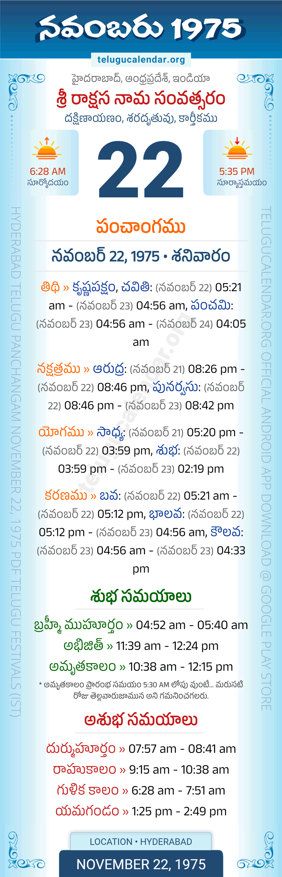 Apart from the Panchangam 1975, you can also find the Sunrise and Sunset (Middle Limb) timings, Paksham, Telugu Year, Yanam, Rutuvu, Telugu Month for Hyderabad. Auspicious Period November 22, 1975 for Hyderabad (Today Good Timings like Abhijit Muhurtham, Amruta Kalam & Brahma Muhurtham) and Inauspicious Period November 22, 1975 for Hyderabad (Bad Timings like Durmuhurtham, Rahukalam, Gulika kalam & Yamagandam) with starting and end timings in the above image in Telugu Language.