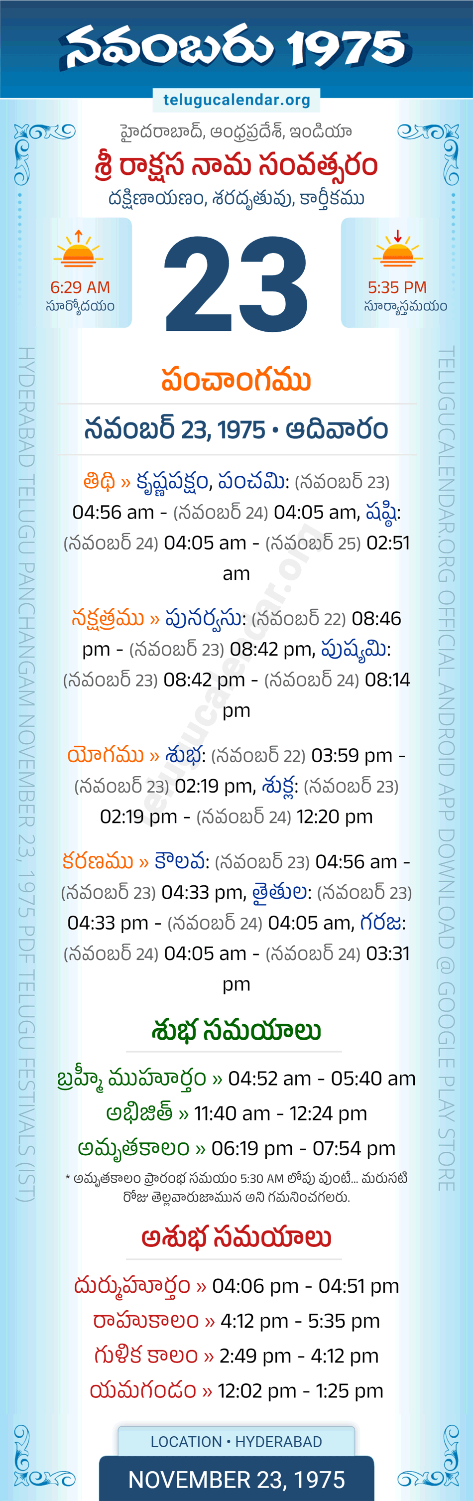 Download » November 23, 1975 » Hyderabad, Andhra Pradesh Telugu Calendar Panchangam Daily Sheet with Auspicious and Inauspicious Timings.