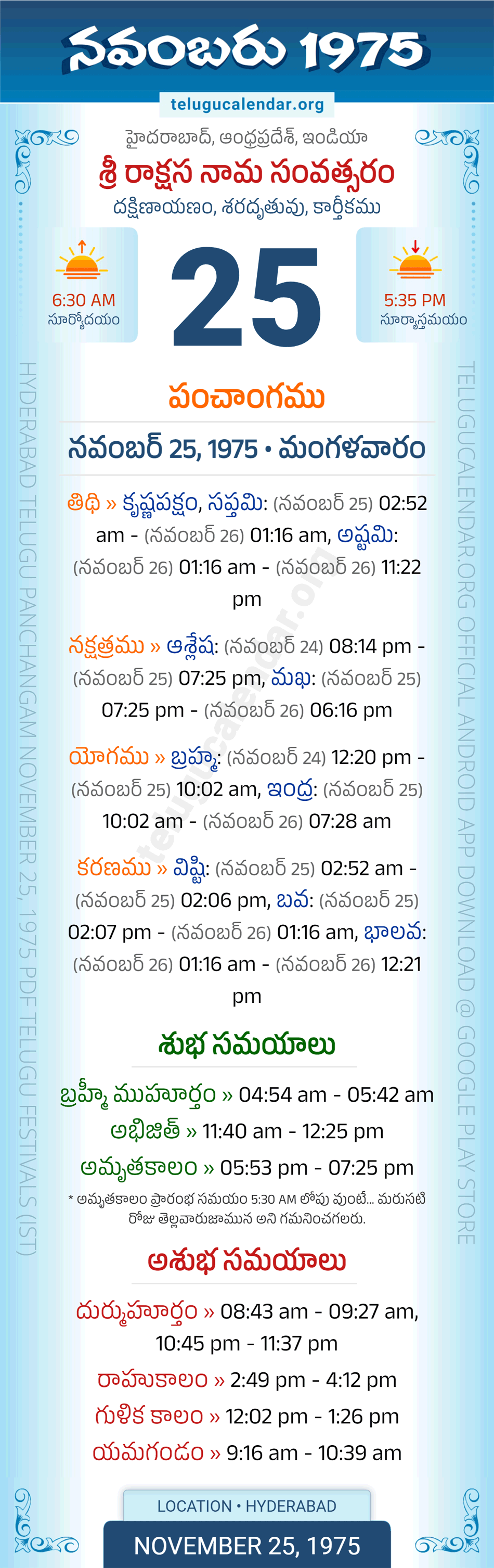 Download » November 25, 1975 » Hyderabad, Andhra Pradesh Telugu Calendar Panchangam Daily Sheet with Auspicious and Inauspicious Timings.