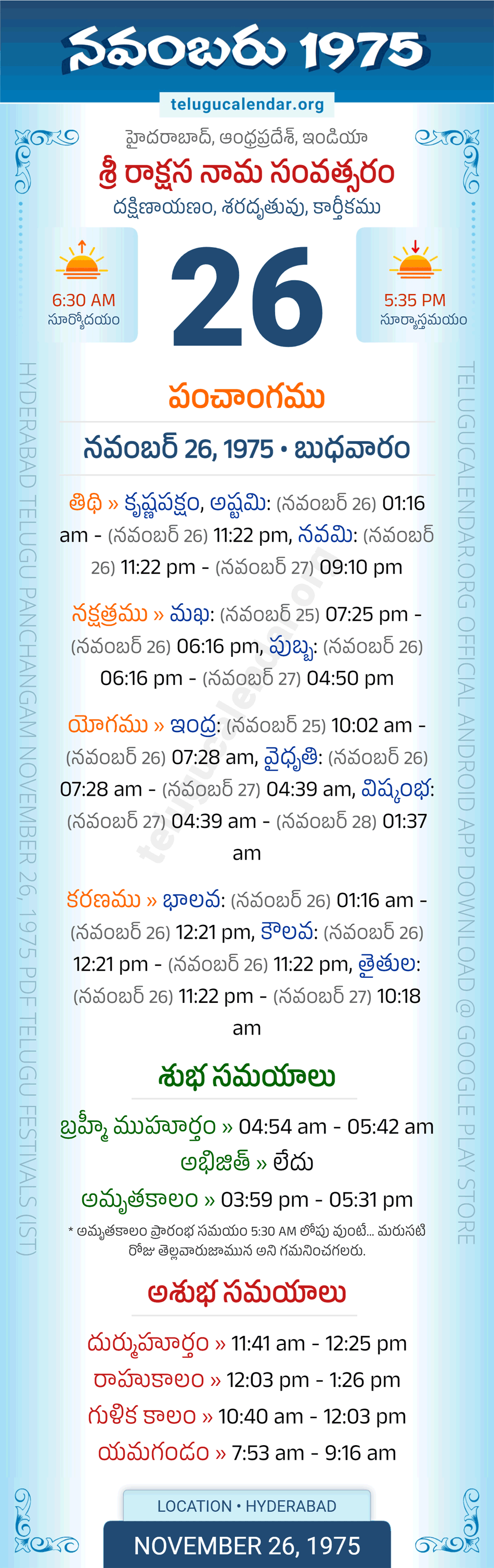 Download » November 26, 1975 » Hyderabad, Andhra Pradesh Telugu Calendar Panchangam Daily Sheet with Auspicious and Inauspicious Timings.