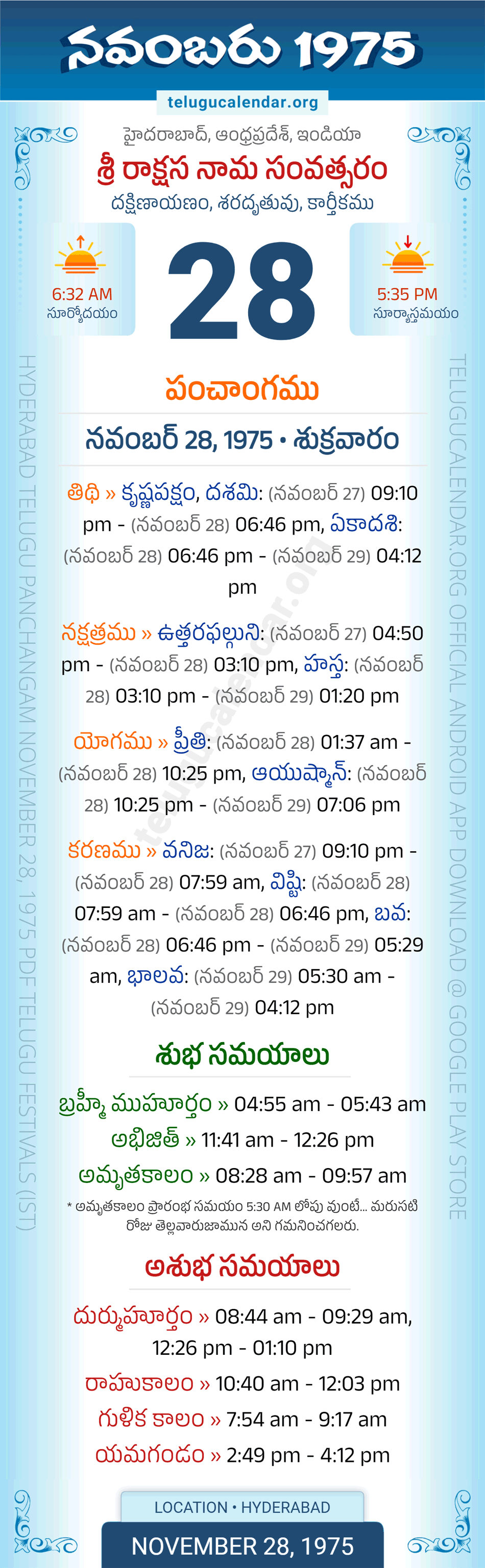 Download » November 28, 1975 » Hyderabad, Andhra Pradesh Telugu Calendar Panchangam Daily Sheet with Auspicious and Inauspicious Timings.