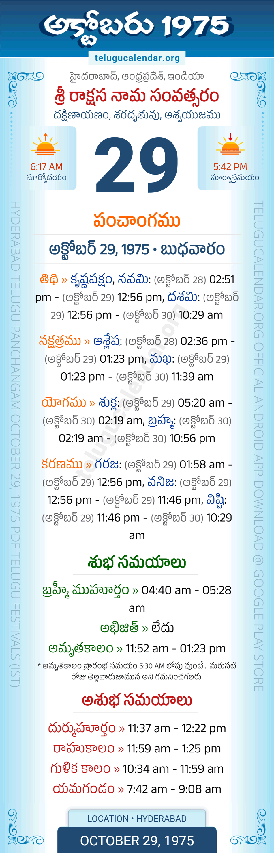 Download » October 29, 1975 » Hyderabad, Andhra Pradesh Telugu Calendar Panchangam Daily Sheet with Auspicious and Inauspicious Timings.