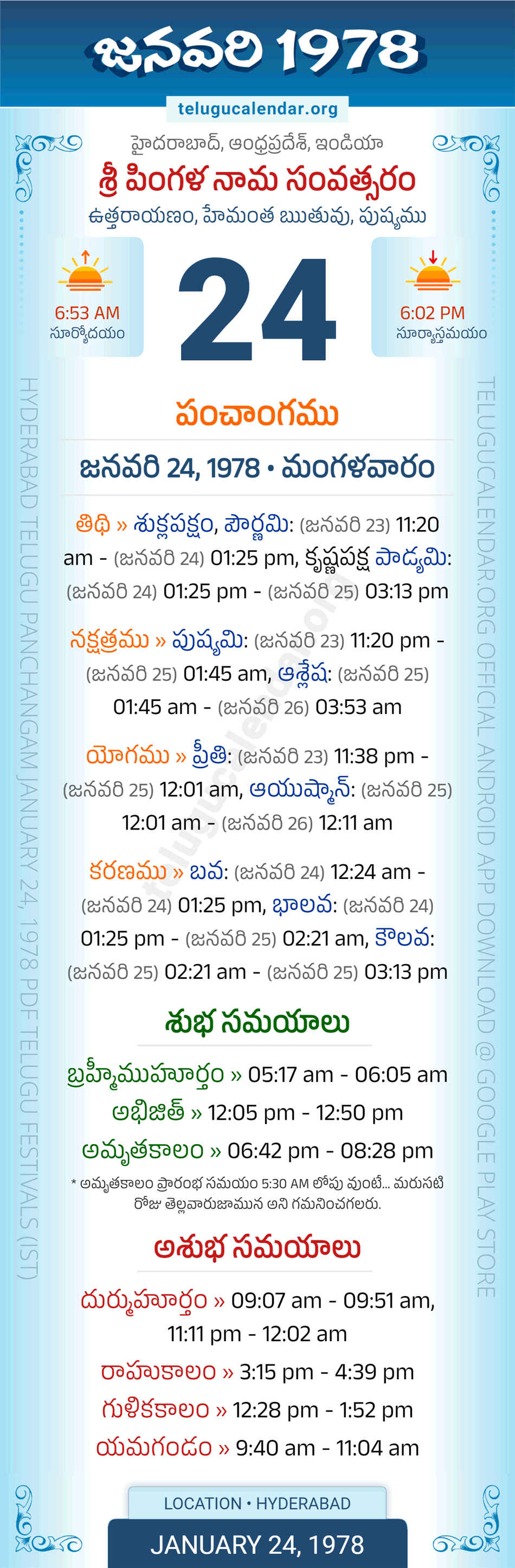 Download » January 24, 1978 » Hyderabad, Andhra Pradesh Telugu Calendar Panchangam Daily Sheet with Auspicious and Inauspicious Timings.