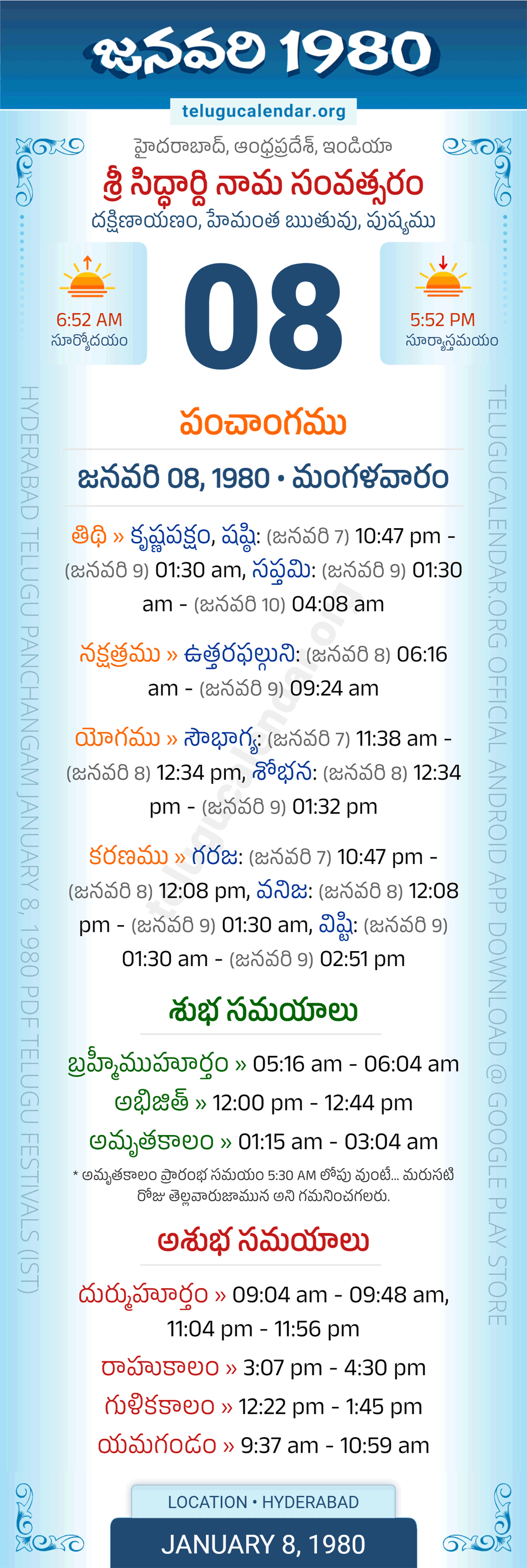 Download » January 8, 1980 » Hyderabad, Andhra Pradesh Telugu Calendar Panchangam Daily Sheet with Auspicious and Inauspicious Timings.