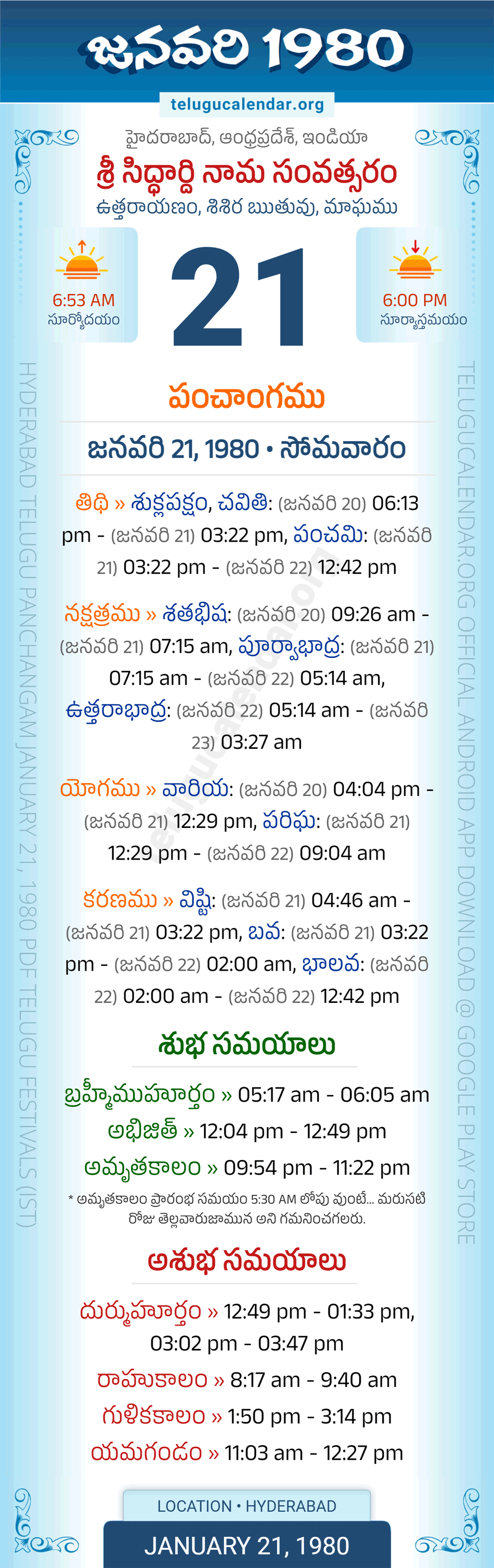 Download » January 21, 1980 » Hyderabad, Andhra Pradesh Telugu Calendar Panchangam Daily Sheet with Auspicious and Inauspicious Timings.