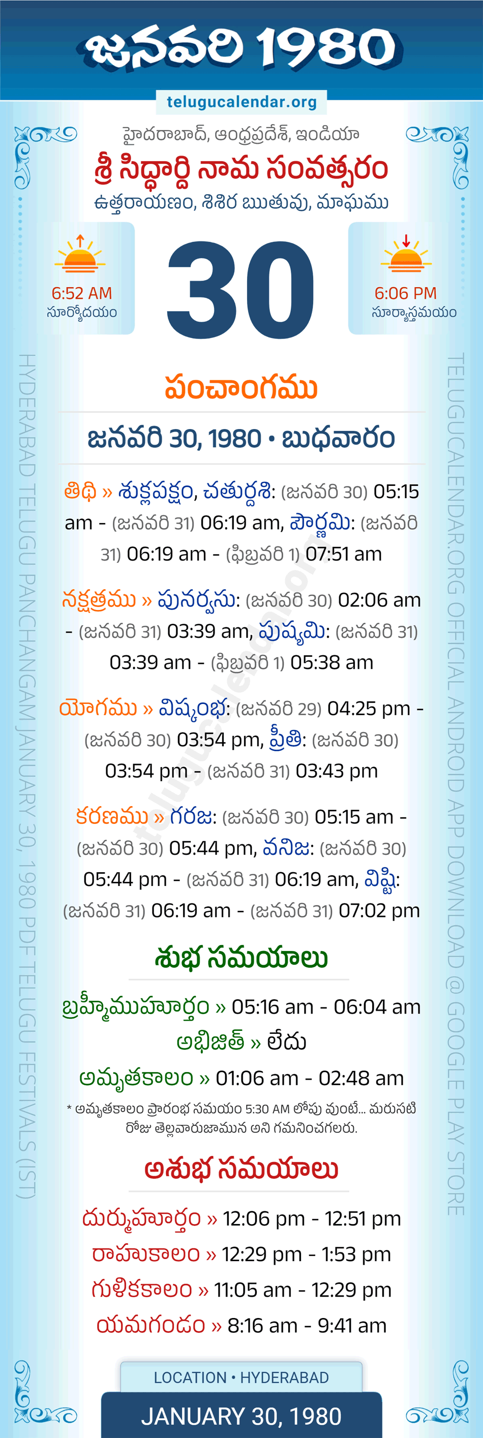 Download » January 30, 1980 » Hyderabad, Andhra Pradesh Telugu Calendar Panchangam Daily Sheet with Auspicious and Inauspicious Timings.