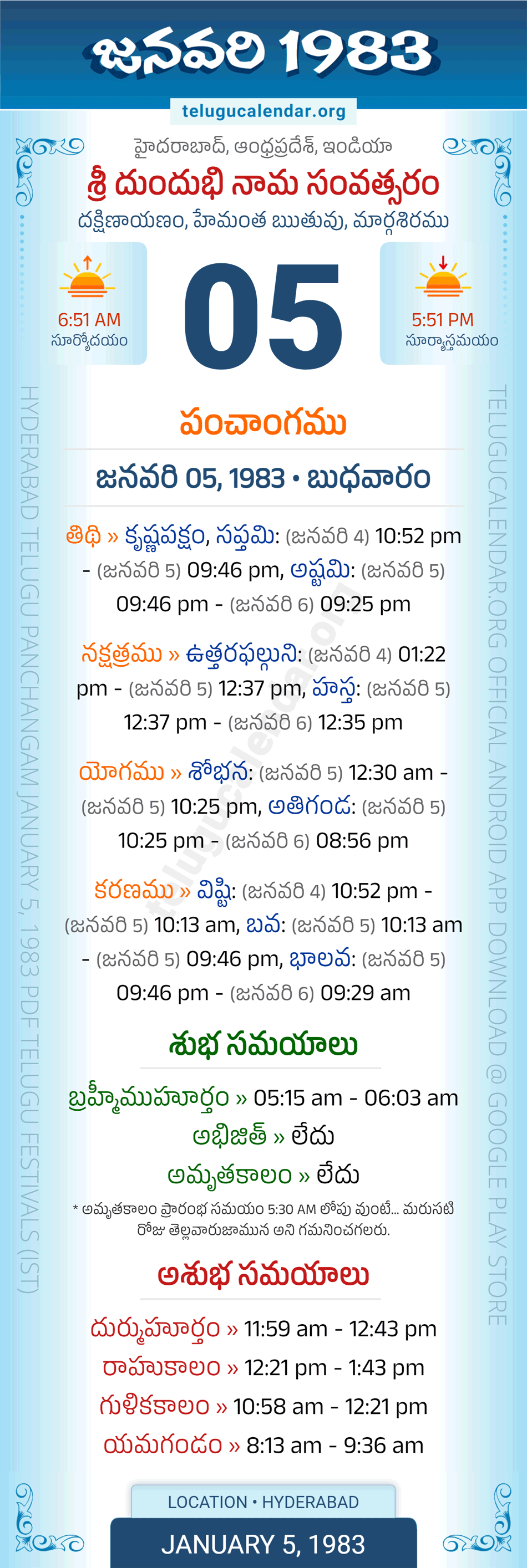 Apart from the Panchangam 1983, you can also find the Sunrise and Sunset (Middle Limb) timings, Paksham, Telugu Year, Yanam, Rutuvu, Telugu Month for Hyderabad. Auspicious Period January 5, 1983 for Hyderabad (Today Good Timings like Abhijit Muhurtham, Amruta Kalam & Brahma Muhurtham) and Inauspicious Period January 5, 1983 for Hyderabad (Bad Timings like Durmuhurtham, Rahukalam, Gulika kalam & Yamagandam) with starting and end timings in the above image in Telugu Language.