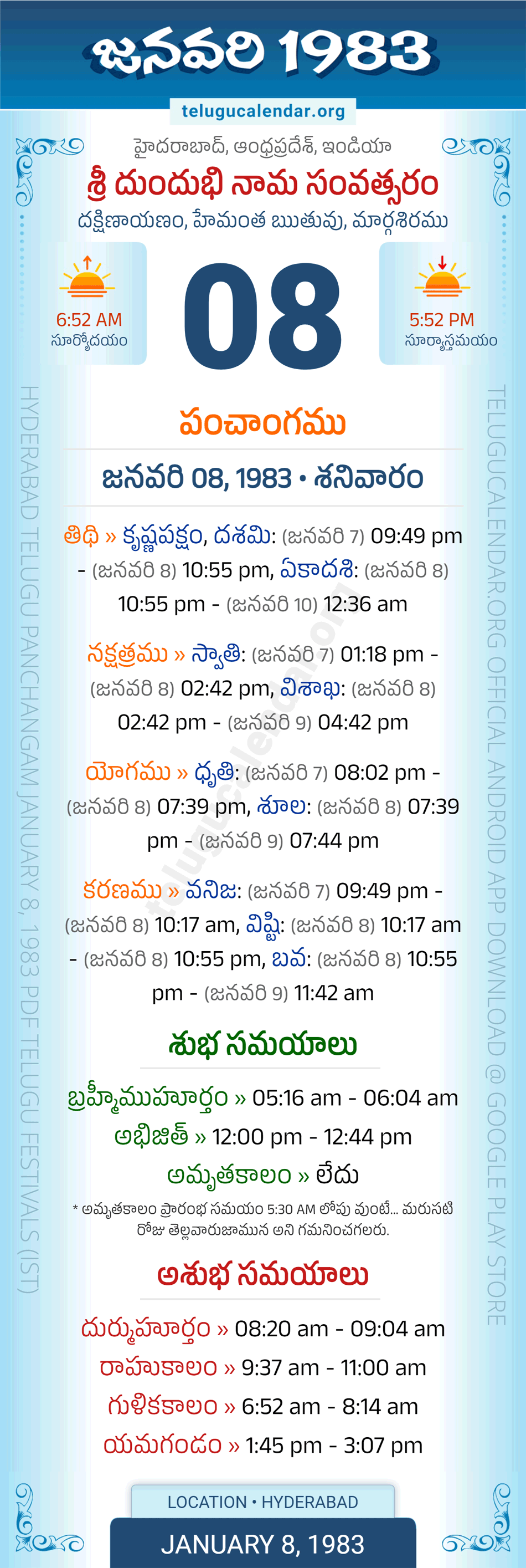 Download » January 8, 1983 » Hyderabad, Andhra Pradesh Telugu Calendar Panchangam Daily Sheet with Auspicious and Inauspicious Timings.