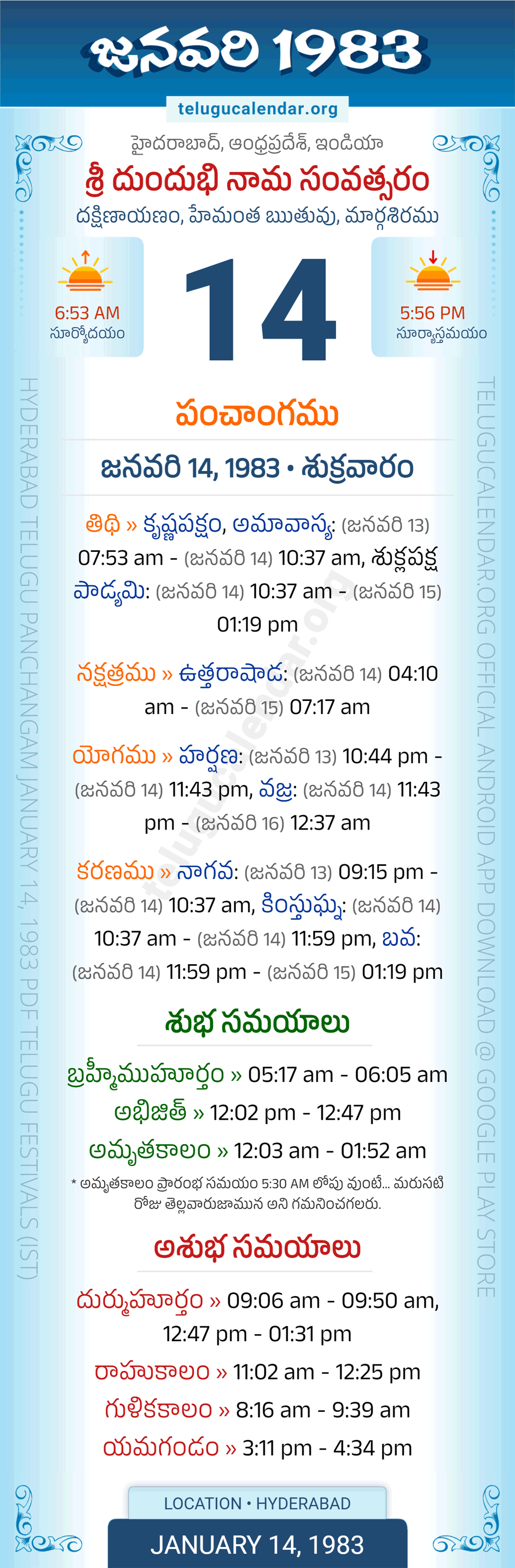 Apart from the Panchangam 1983, you can also find the Sunrise and Sunset (Middle Limb) timings, Paksham, Telugu Year, Yanam, Rutuvu, Telugu Month for Hyderabad. Auspicious Period January 14, 1983 for Hyderabad (Today Good Timings like Abhijit Muhurtham, Amruta Kalam & Brahma Muhurtham) and Inauspicious Period January 14, 1983 for Hyderabad (Bad Timings like Durmuhurtham, Rahukalam, Gulika kalam & Yamagandam) with starting and end timings in the above image in Telugu Language.