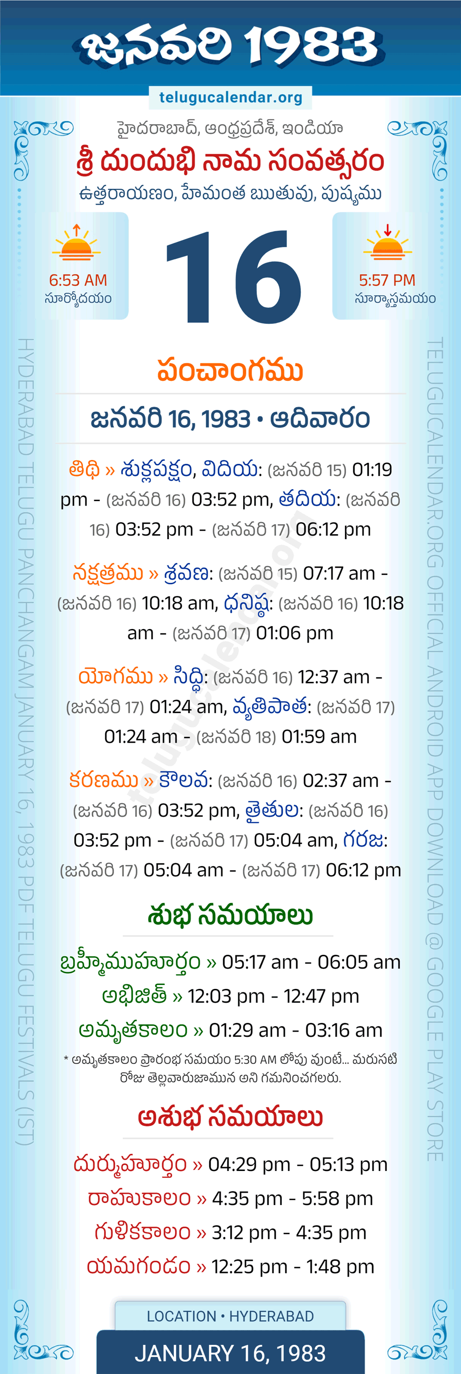 Apart from the Panchangam 1983, you can also find the Sunrise and Sunset (Middle Limb) timings, Paksham, Telugu Year, Yanam, Rutuvu, Telugu Month for Hyderabad. Auspicious Period January 16, 1983 for Hyderabad (Today Good Timings like Abhijit Muhurtham, Amruta Kalam & Brahma Muhurtham) and Inauspicious Period January 16, 1983 for Hyderabad (Bad Timings like Durmuhurtham, Rahukalam, Gulika kalam & Yamagandam) with starting and end timings in the above image in Telugu Language.