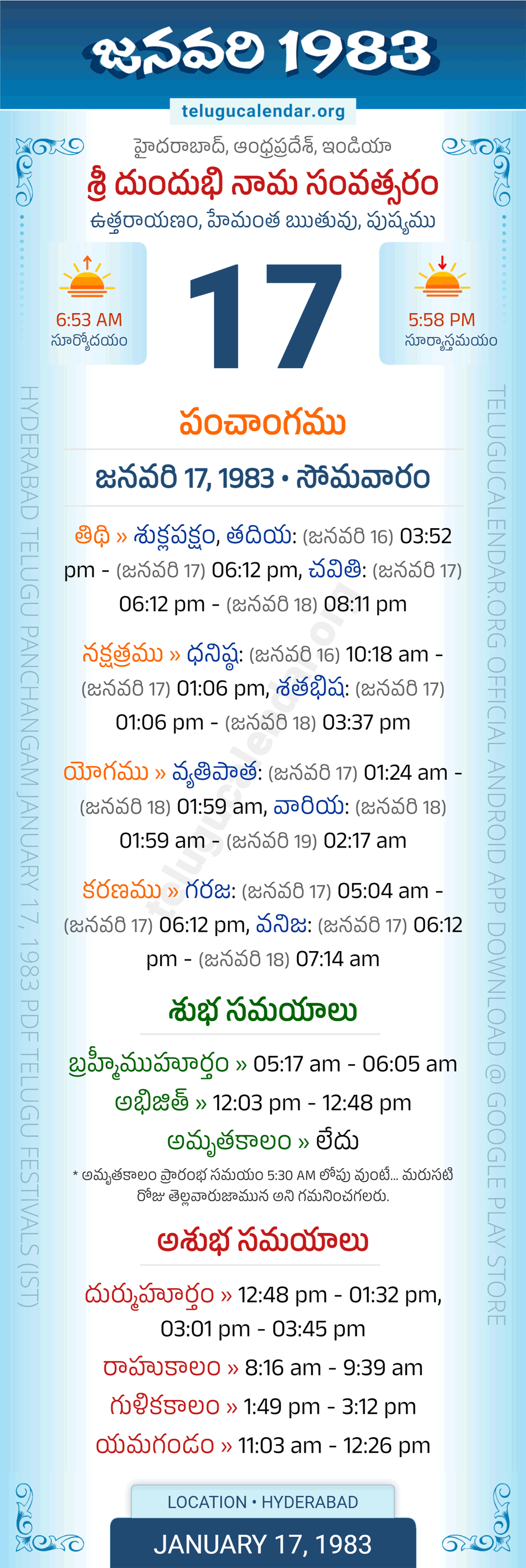 Apart from the Panchangam 1983, you can also find the Sunrise and Sunset (Middle Limb) timings, Paksham, Telugu Year, Yanam, Rutuvu, Telugu Month for Hyderabad. Auspicious Period January 17, 1983 for Hyderabad (Today Good Timings like Abhijit Muhurtham, Amruta Kalam & Brahma Muhurtham) and Inauspicious Period January 17, 1983 for Hyderabad (Bad Timings like Durmuhurtham, Rahukalam, Gulika kalam & Yamagandam) with starting and end timings in the above image in Telugu Language.