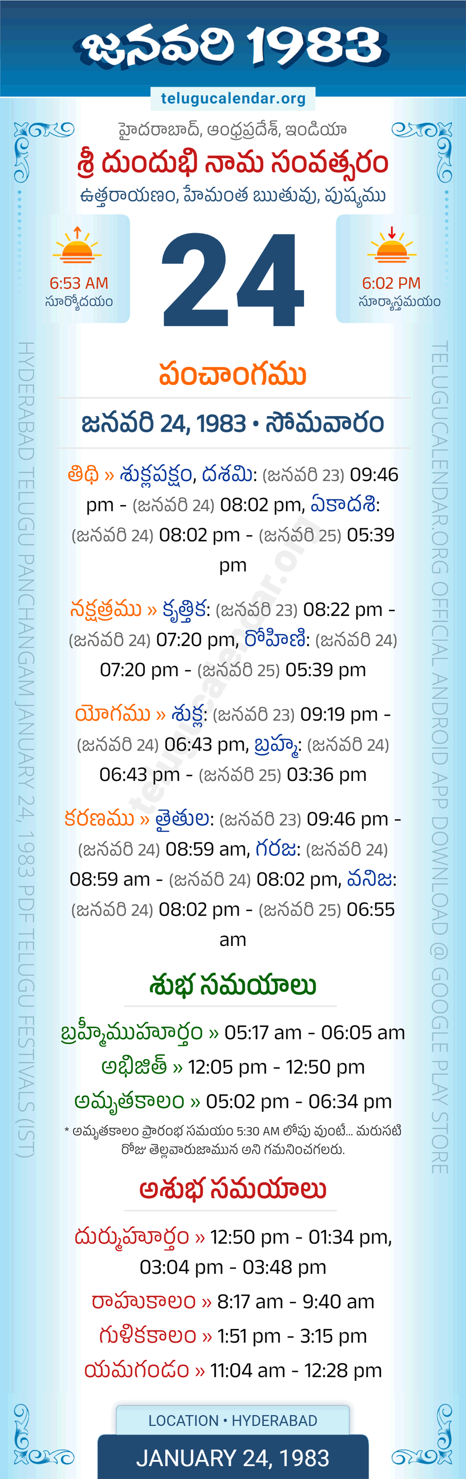 Apart from the Panchangam 1983, you can also find the Sunrise and Sunset (Middle Limb) timings, Paksham, Telugu Year, Yanam, Rutuvu, Telugu Month for Hyderabad. Auspicious Period January 24, 1983 for Hyderabad (Today Good Timings like Abhijit Muhurtham, Amruta Kalam & Brahma Muhurtham) and Inauspicious Period January 24, 1983 for Hyderabad (Bad Timings like Durmuhurtham, Rahukalam, Gulika kalam & Yamagandam) with starting and end timings in the above image in Telugu Language.