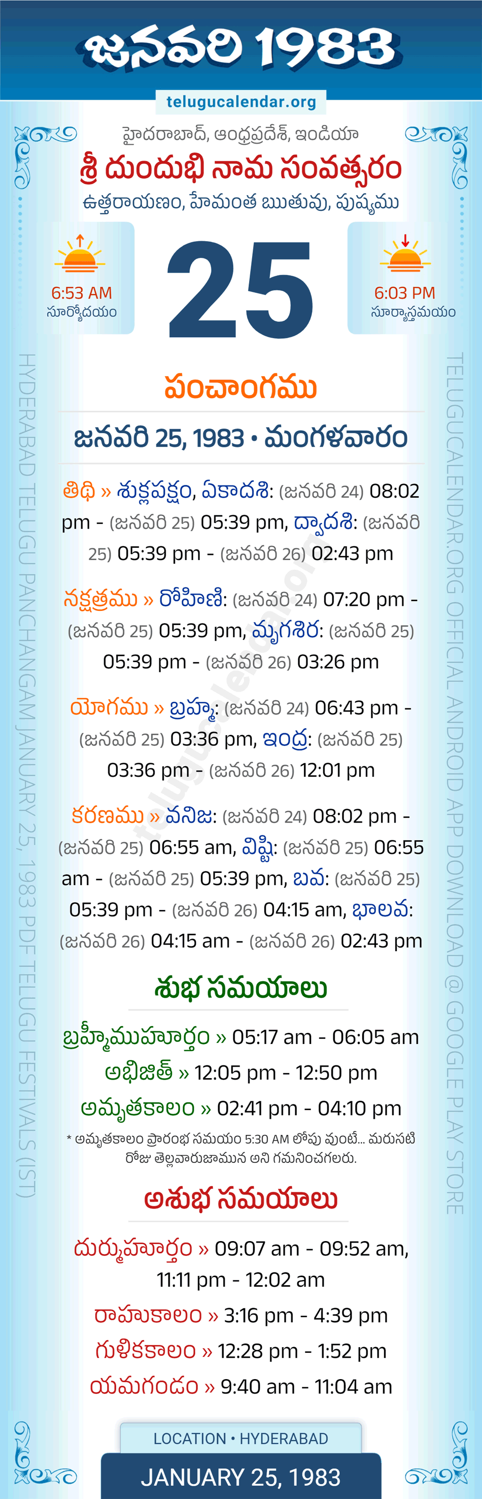 Download » January 25, 1983 » Hyderabad, Andhra Pradesh Telugu Calendar Panchangam Daily Sheet with Auspicious and Inauspicious Timings.
