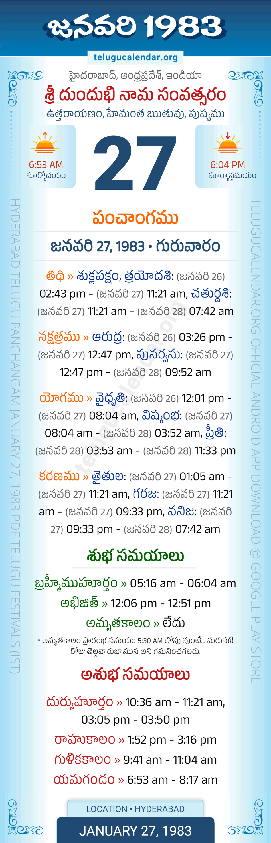 Apart from the Panchangam 1983, you can also find the Sunrise and Sunset (Middle Limb) timings, Paksham, Telugu Year, Yanam, Rutuvu, Telugu Month for Hyderabad. Auspicious Period January 27, 1983 for Hyderabad (Today Good Timings like Abhijit Muhurtham, Amruta Kalam & Brahma Muhurtham) and Inauspicious Period January 27, 1983 for Hyderabad (Bad Timings like Durmuhurtham, Rahukalam, Gulika kalam & Yamagandam) with starting and end timings in the above image in Telugu Language.