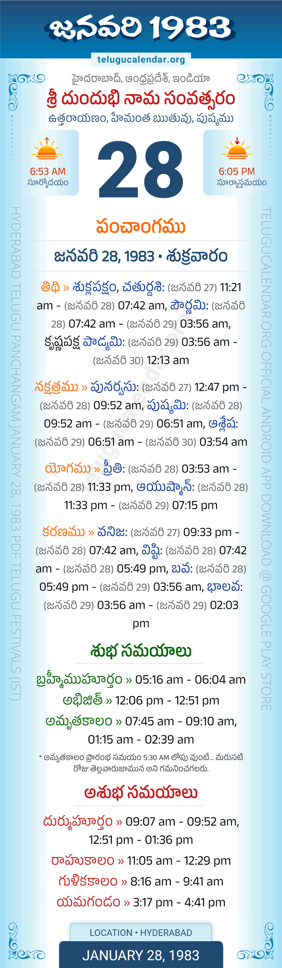 Apart from the Panchangam 1983, you can also find the Sunrise and Sunset (Middle Limb) timings, Paksham, Telugu Year, Yanam, Rutuvu, Telugu Month for Hyderabad. Auspicious Period January 28, 1983 for Hyderabad (Today Good Timings like Abhijit Muhurtham, Amruta Kalam & Brahma Muhurtham) and Inauspicious Period January 28, 1983 for Hyderabad (Bad Timings like Durmuhurtham, Rahukalam, Gulika kalam & Yamagandam) with starting and end timings in the above image in Telugu Language.