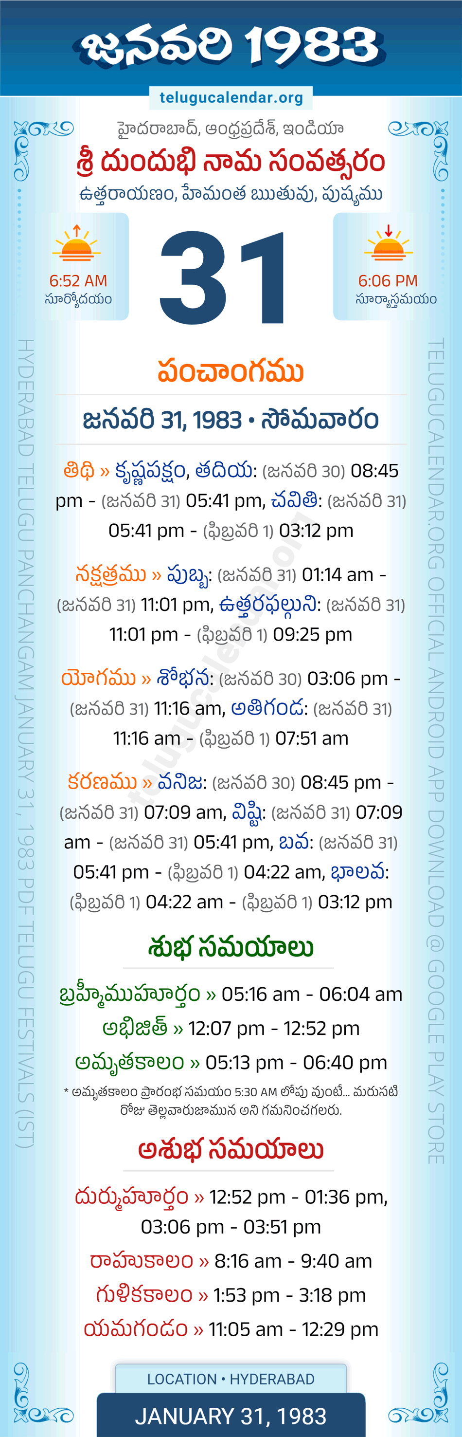 Apart from the Panchangam 1983, you can also find the Sunrise and Sunset (Middle Limb) timings, Paksham, Telugu Year, Yanam, Rutuvu, Telugu Month for Hyderabad. Auspicious Period January 31, 1983 for Hyderabad (Today Good Timings like Abhijit Muhurtham, Amruta Kalam & Brahma Muhurtham) and Inauspicious Period January 31, 1983 for Hyderabad (Bad Timings like Durmuhurtham, Rahukalam, Gulika kalam & Yamagandam) with starting and end timings in the above image in Telugu Language.