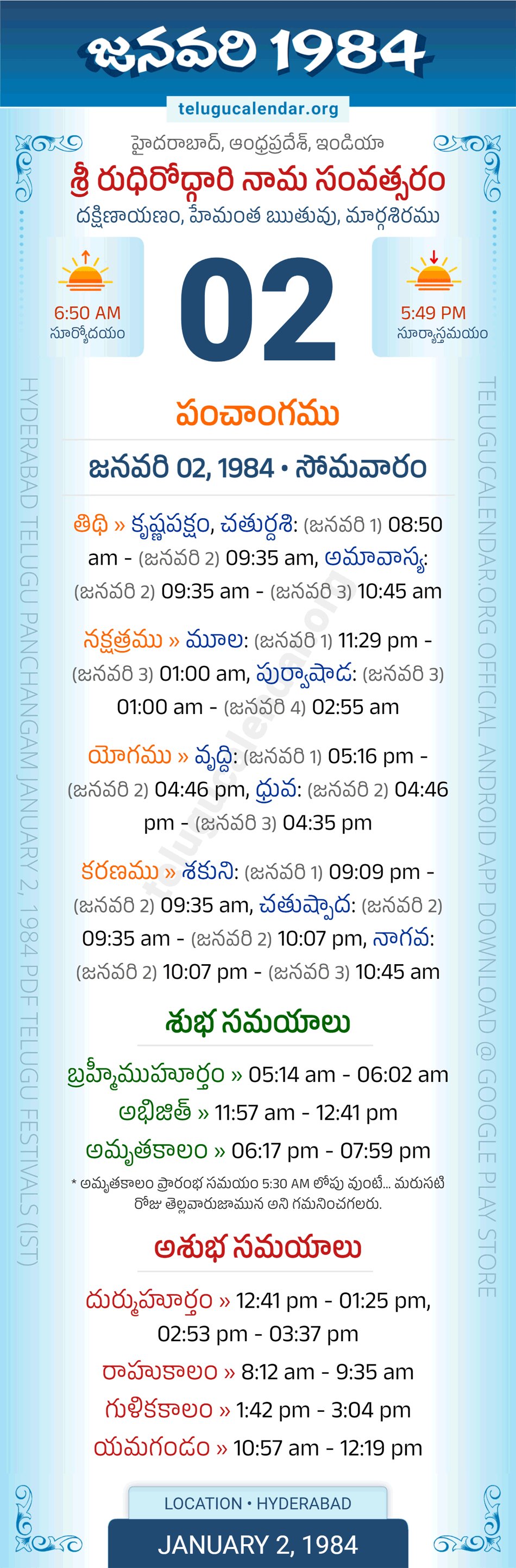 Apart from the Panchangam 1984, you can also find the Sunrise and Sunset (Middle Limb) timings, Paksham, Telugu Year, Yanam, Rutuvu, Telugu Month for Hyderabad. Auspicious Period January 2, 1984 for Hyderabad (Today Good Timings like Abhijit Muhurtham, Amruta Kalam & Brahma Muhurtham) and Inauspicious Period January 2, 1984 for Hyderabad (Bad Timings like Durmuhurtham, Rahukalam, Gulika kalam & Yamagandam) with starting and end timings in the above image in Telugu Language.