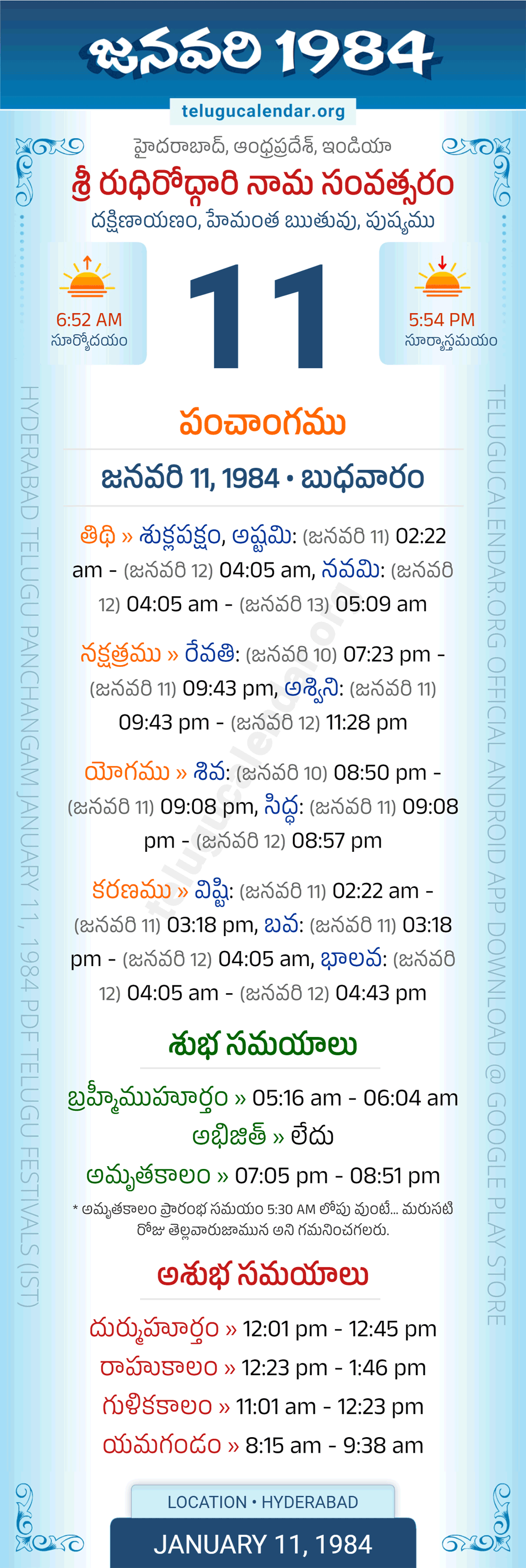 Download » January 11, 1984 » Hyderabad, Andhra Pradesh Telugu Calendar Panchangam Daily Sheet with Auspicious and Inauspicious Timings.