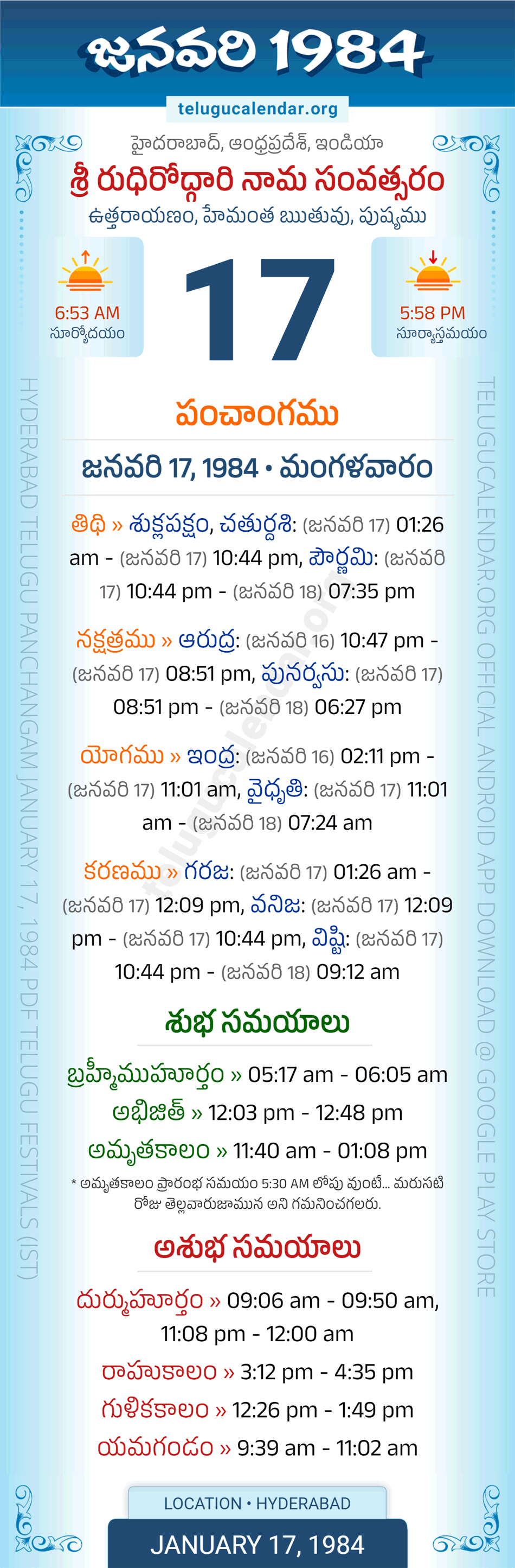 Download » January 17, 1984 » Hyderabad, Andhra Pradesh Telugu Calendar Panchangam Daily Sheet with Auspicious and Inauspicious Timings.