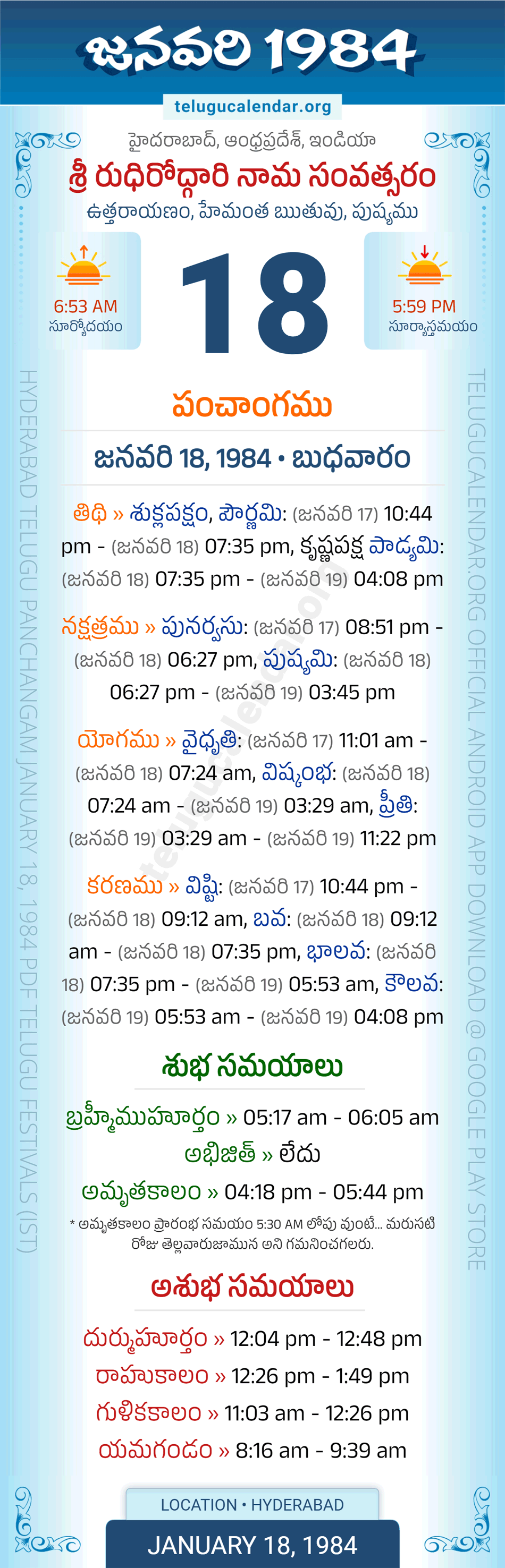 Download » January 18, 1984 » Hyderabad, Andhra Pradesh Telugu Calendar Panchangam Daily Sheet with Auspicious and Inauspicious Timings.