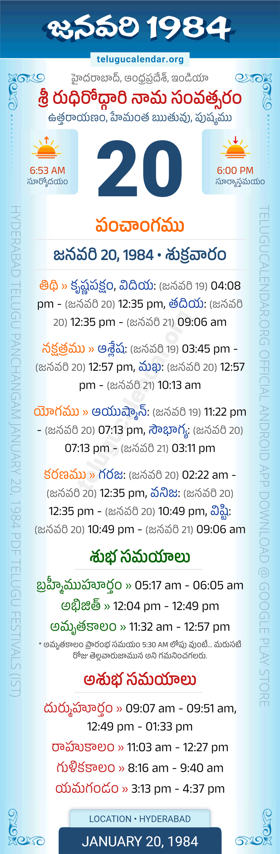 Download » January 20, 1984 » Hyderabad, Andhra Pradesh Telugu Calendar Panchangam Daily Sheet with Auspicious and Inauspicious Timings.