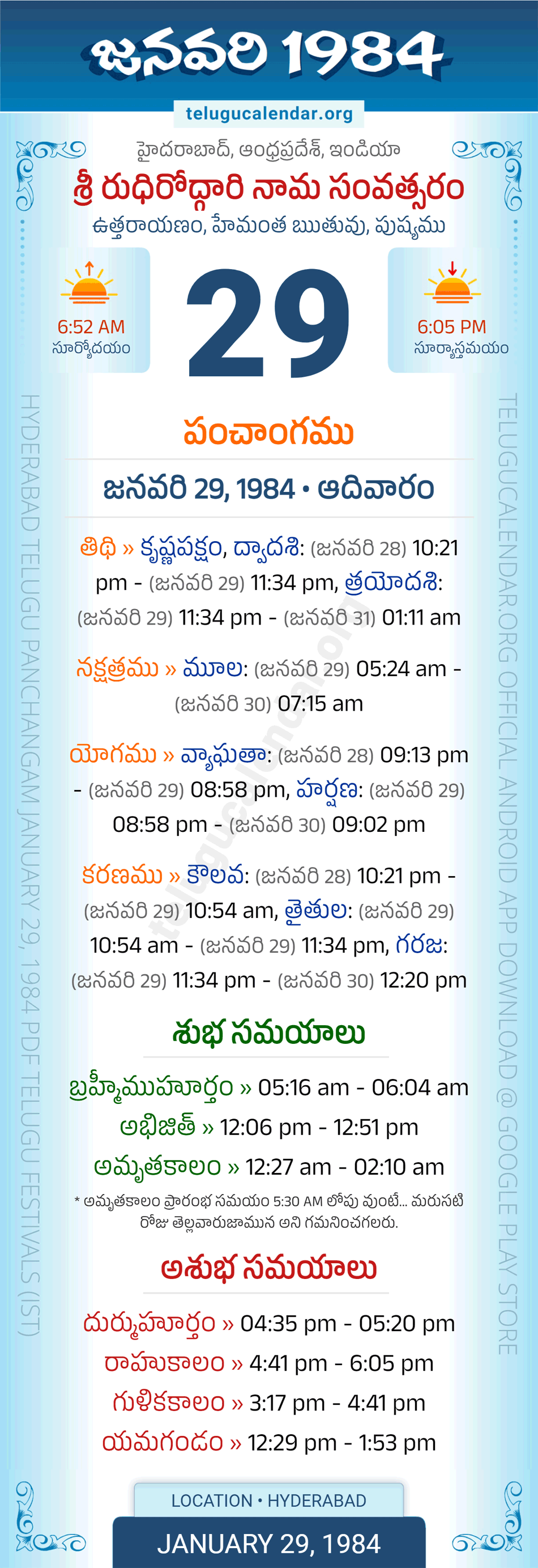 Apart from the Panchangam 1984, you can also find the Sunrise and Sunset (Middle Limb) timings, Paksham, Telugu Year, Yanam, Rutuvu, Telugu Month for Hyderabad. Auspicious Period January 29, 1984 for Hyderabad (Today Good Timings like Abhijit Muhurtham, Amruta Kalam & Brahma Muhurtham) and Inauspicious Period January 29, 1984 for Hyderabad (Bad Timings like Durmuhurtham, Rahukalam, Gulika kalam & Yamagandam) with starting and end timings in the above image in Telugu Language.