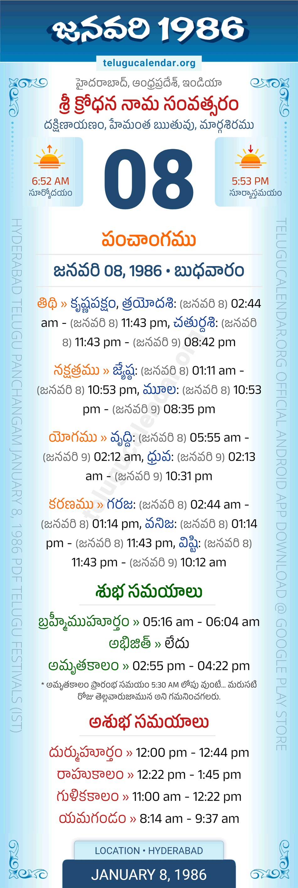 Download » January 8, 1986 » Hyderabad, Andhra Pradesh Telugu Calendar Panchangam Daily Sheet with Auspicious and Inauspicious Timings.