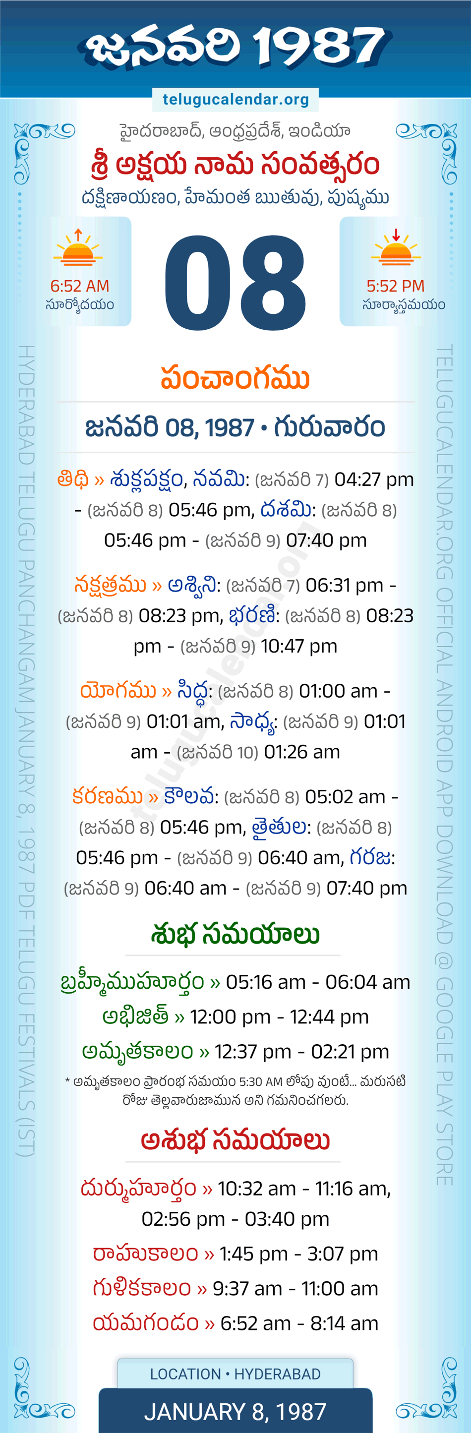Download » January 8, 1987 » Hyderabad, Andhra Pradesh Telugu Calendar Panchangam Daily Sheet with Auspicious and Inauspicious Timings.