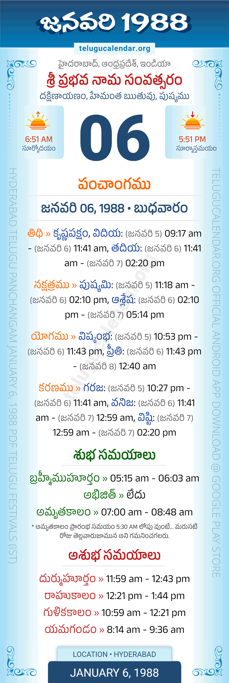 Download » January 6, 1988 » Hyderabad, Andhra Pradesh Telugu Calendar Panchangam Daily Sheet with Auspicious and Inauspicious Timings.