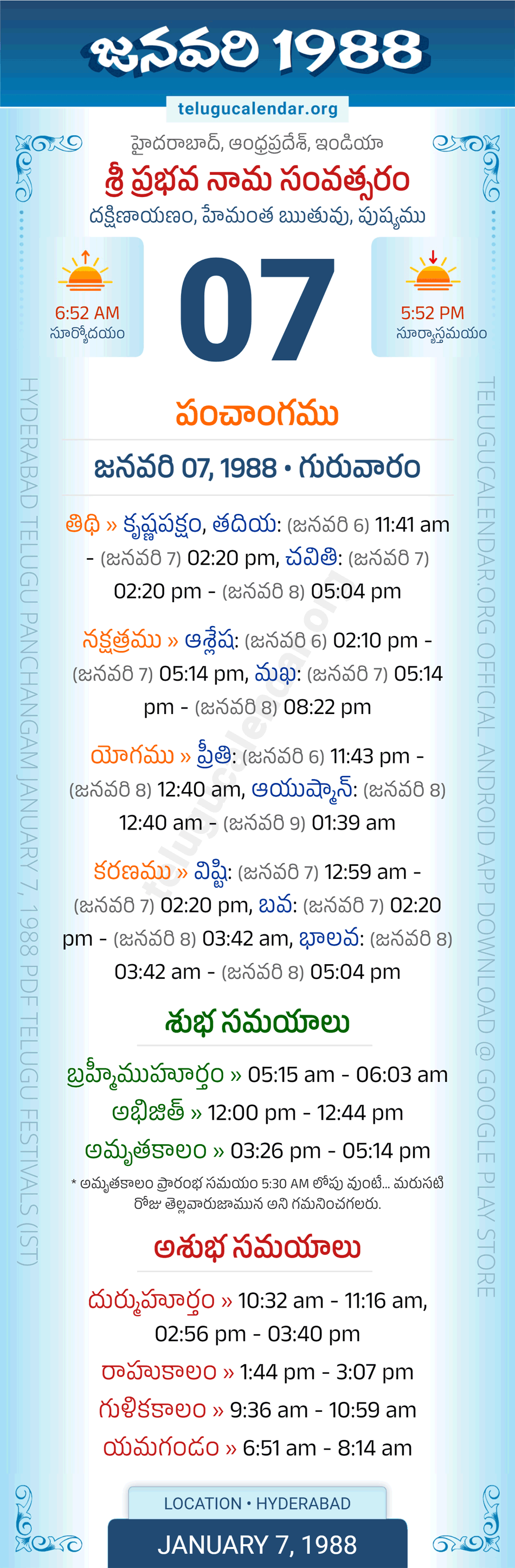 Download » January 7, 1988 » Hyderabad, Andhra Pradesh Telugu Calendar Panchangam Daily Sheet with Auspicious and Inauspicious Timings.